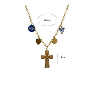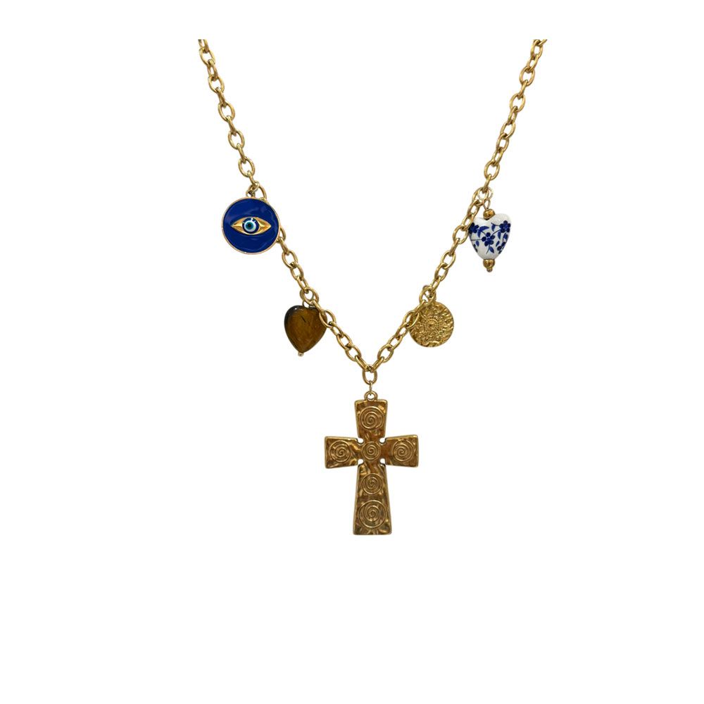 Ατσάλινο κολιέ με χρυσή αλυσίδα και διακοσμητικά charms — σταυρό, μάτι, καρδιά και νόμισμα. Ένα εντυπωσιακό, μοντέρνο κόσμημα που συνδυάζει κομψότητα και στυλ, ιδανικό για κάθε περίσταση.Μήκος: 43 + 6 cmΜέγεθος σταυρού: 4 cm
