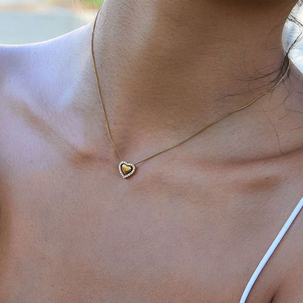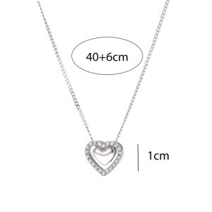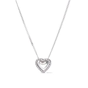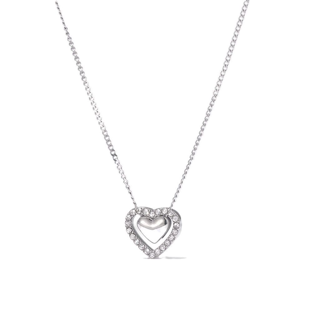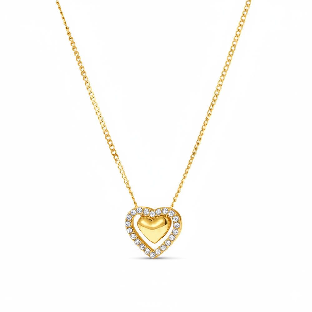 Λαμπερό κολιέ με διπλό μοτίβο καρδιάς: εξωτερική καρδιά διακοσμημένη με κρυστάλλους και εσωτερική μεταλλική καρδιά για extra λάμψη. Ένα διαχρονικό, θηλυκό κόσμημα που αναδεικνύει κάθε στυλ, ιδανικό για δώρο.Μήκος αλυσίδας: 40+6 cm · Μέγεθος μοτίβου: περίπου 1 cm.Διαθέσιμο σε χρυσό και ασημί.