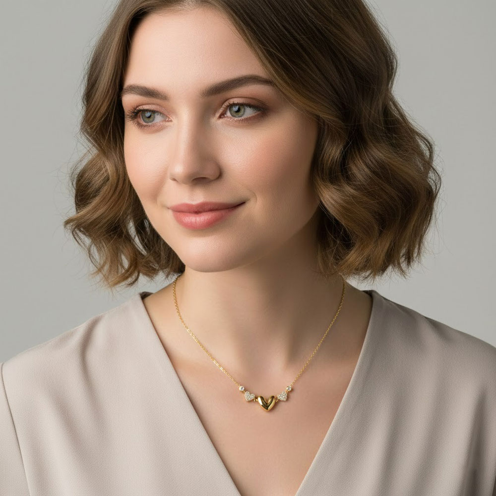 Κομψό κολιέ από ανοξείδωτο ατσάλι με σχέδιο τριπλής καρδιάς, διακοσμημένο με λαμπερά στρας που προσθέτουν διακριτική λάμψη. Ένα ρομαντικό αλλά ταυτόχρονα μοντέρνο κόσμημα, ιδανικό για καθημερινές και πιο ιδιαίτερες εμφανίσεις. Συνδυάζεται εύκολα μόνο του ή σε layering με άλλα κολιέ.