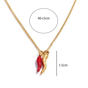 Ατσάλινο κολιέ με δύο κρεμαστά στοιχεία σε σχήμα πιπεριάς, εκ των οποίων το ένα σε έντονο κόκκινο στοιχείο που συμβολίζει τύχη, προστασία και θετική ενέργεια. Διαθέτει λεπτή αλυσίδα με προέκταση για ρυθμιζόμενη εφαρμογή και μοντέρνο, παιχνιδιάρικο χαρακτήρα. Ιδανικό για καθημερινή χρήση αλλά και ως διακριτικό γούρι.