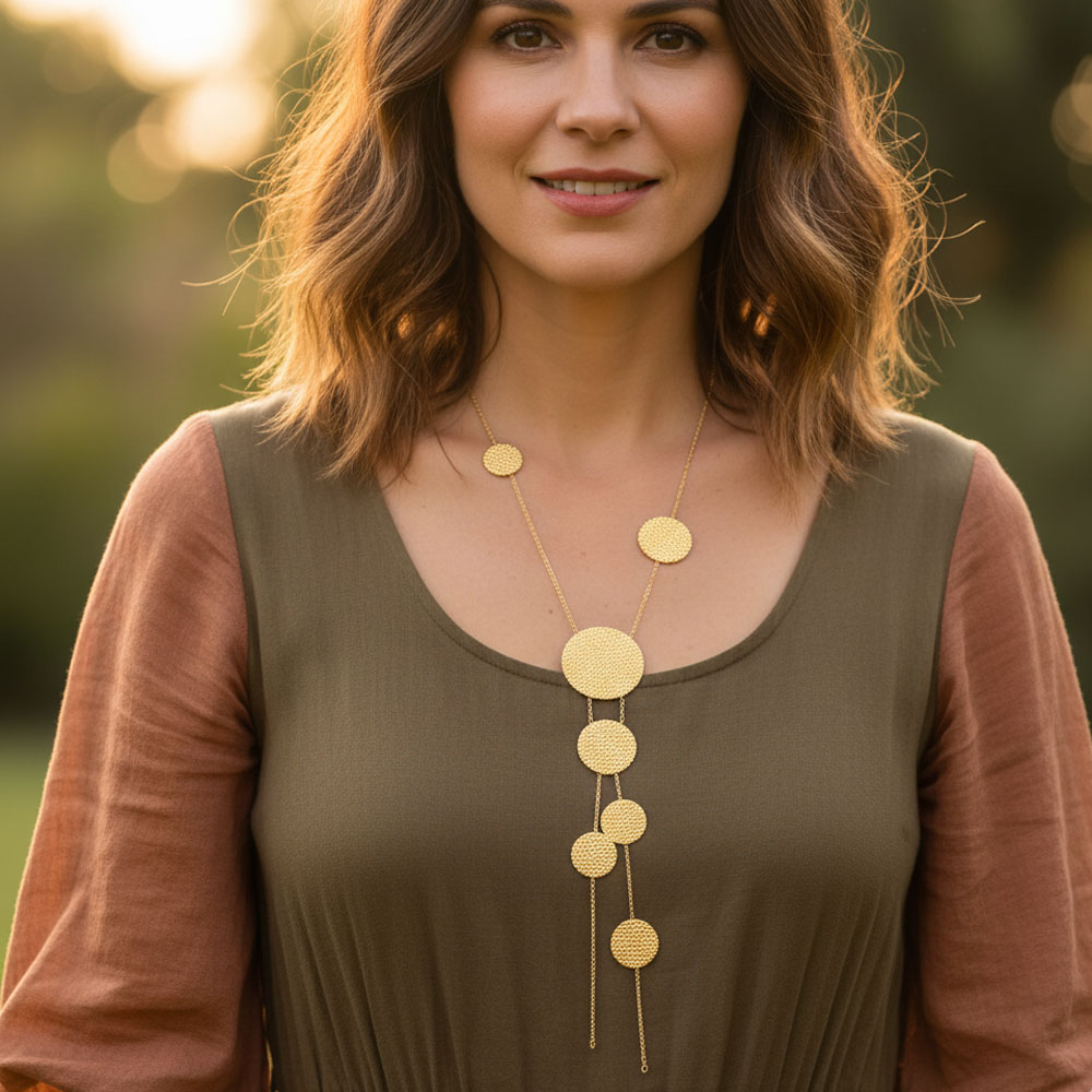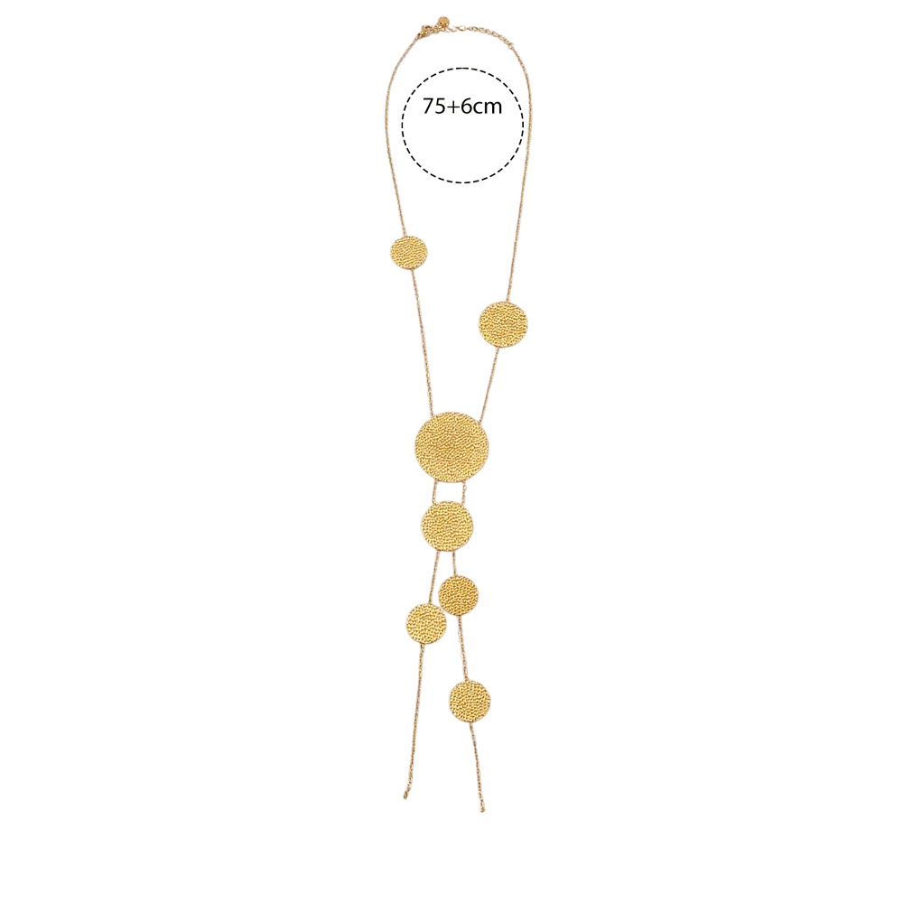 Μοντέρνο μακρύ κολιέ από ατσάλι με εντυπωσιακά κυκλικά στοιχεία σε ματ υφή. Ο minimal και elegant σχεδιασμός του το καθιστά ιδανικό για να ολοκληρώσει κάθε εμφάνιση, από καθημερινή έως πιο επίσημη.Κατασκευασμένο από υψηλής ποιότητας ατσάλι που δεν μαυρίζει, διατηρεί τη λάμψη και τη φινέτσα του με την πάροδο του χρόνου. Ένα statement κόσμημα που προσθέτει χαρακτήρα και στυλ σε κάθε look.