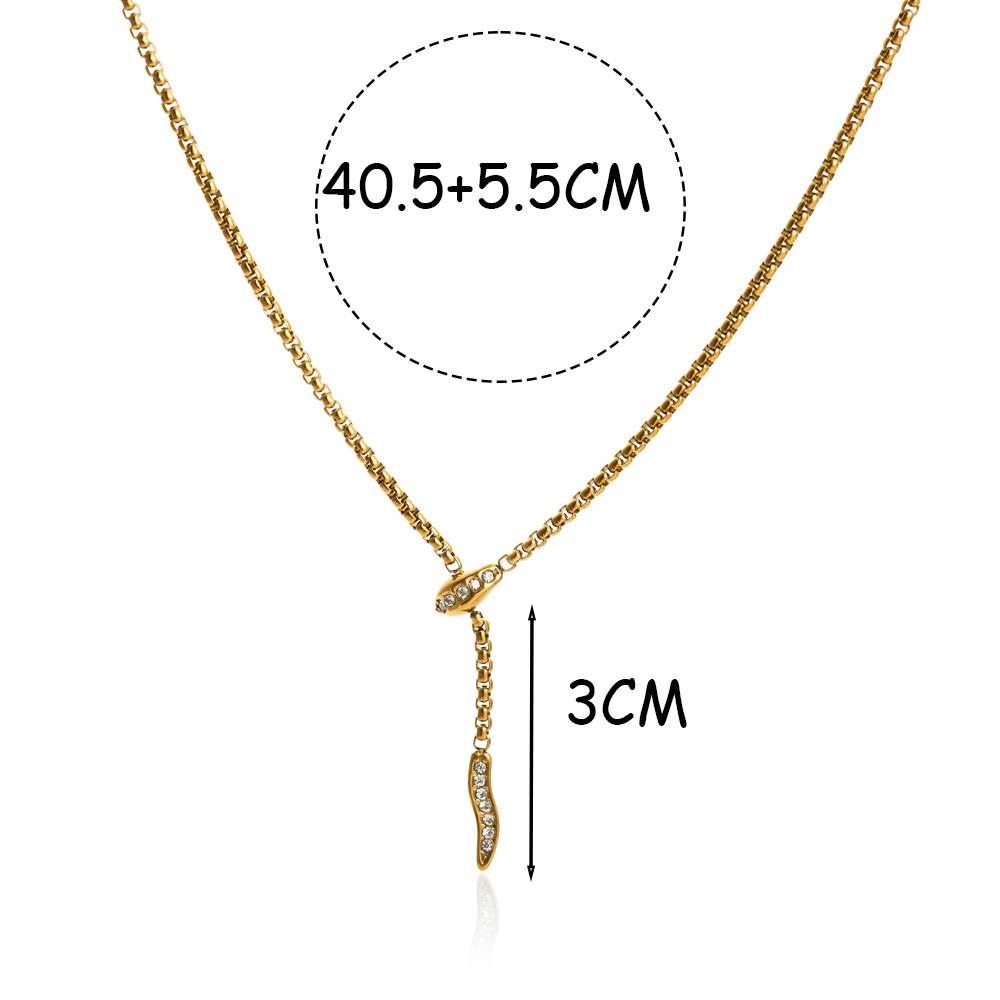 Κομψό ατσάλινο κολιέ με μοντέρνο σχέδιο φίδι, διακοσμημένο με λαμπερά ζιργκόν. Η λεπτή χρυσή αλυσίδα και η καμπύλη του μοτίφ δημιουργούν ένα εκλεπτυσμένο αποτέλεσμα, ιδανικό για εμφανίσεις με διακριτική πολυτέλεια. Ένα statement κόσμημα που συνδυάζει θηλυκότητα και δυναμισμό.