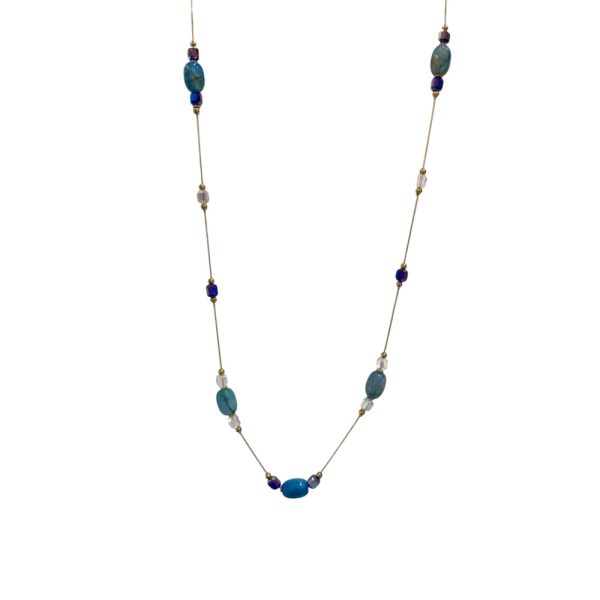 Εντυπωσιακό μακρύ κολιέ με μπλε και μωβ χάντρες σε διαφορετικά σχήματα και αποχρώσεις, δεμένες σε λεπτή χρυσή αλυσίδα. Οι ψυχροί τόνοι του μπλε συνδυάζονται αρμονικά με τις ρομαντικές πινελιές του μωβ, δημιουργώντας ένα κομψό και διακριτικά λαμπερό αποτέλεσμα.Ιδανικό για να ολοκληρώσει καθημερινές αλλά και πιο ιδιαίτερες εμφανίσεις.