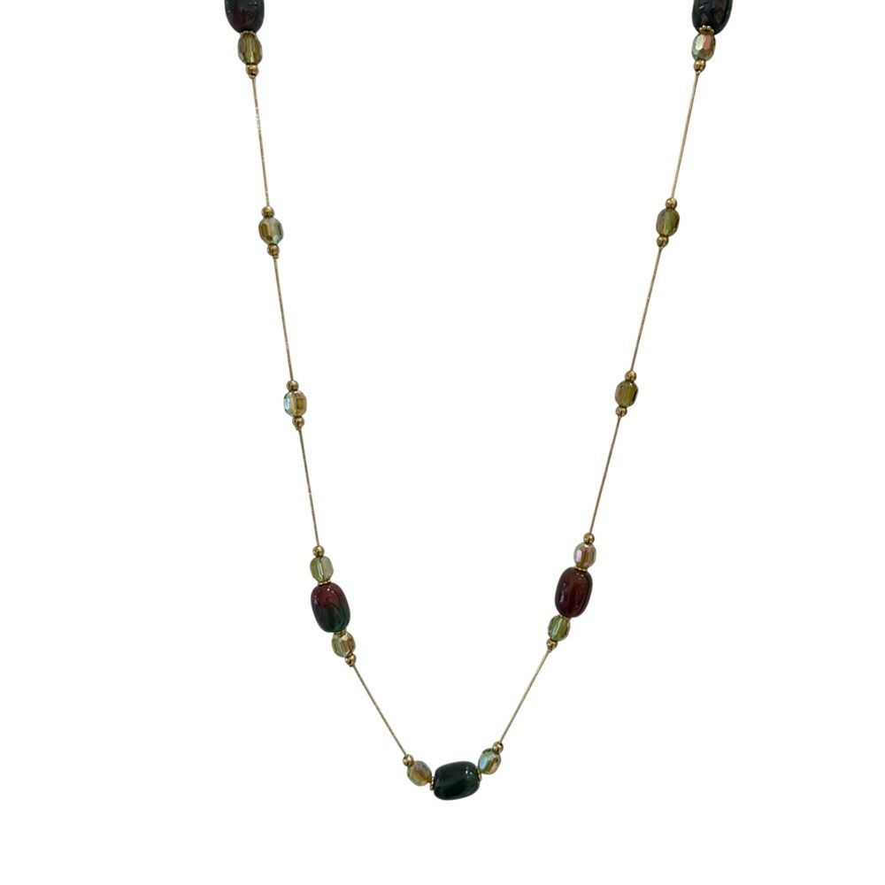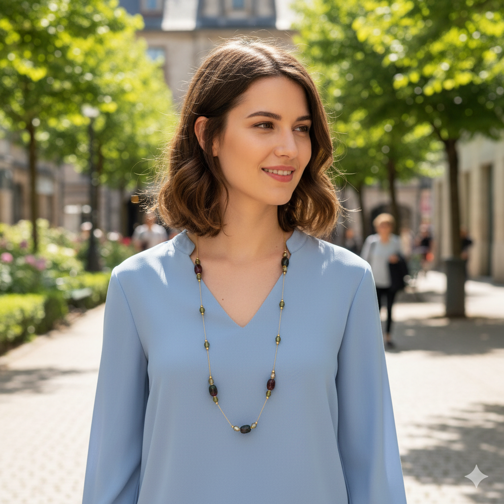 Κομψό μακρύ κολιέ με πράσινες και καφέ χάντρες σε διαφορετικά σχήματα και αποχρώσεις, δεμένες σε λεπτή χρυσή αλυσίδα. Οι γήινες αποχρώσεις του συνδυάζονται αρμονικά, δημιουργώντας ένα φυσικό και elegant αποτέλεσμα.Ιδανικό για καθημερινές εμφανίσεις, προσθέτει ζεστασιά και στυλ σε κάθε ντύσιμο. Μήκος: 86 + 6 cmΣτυλ: Boho – Natural – Casual Chic