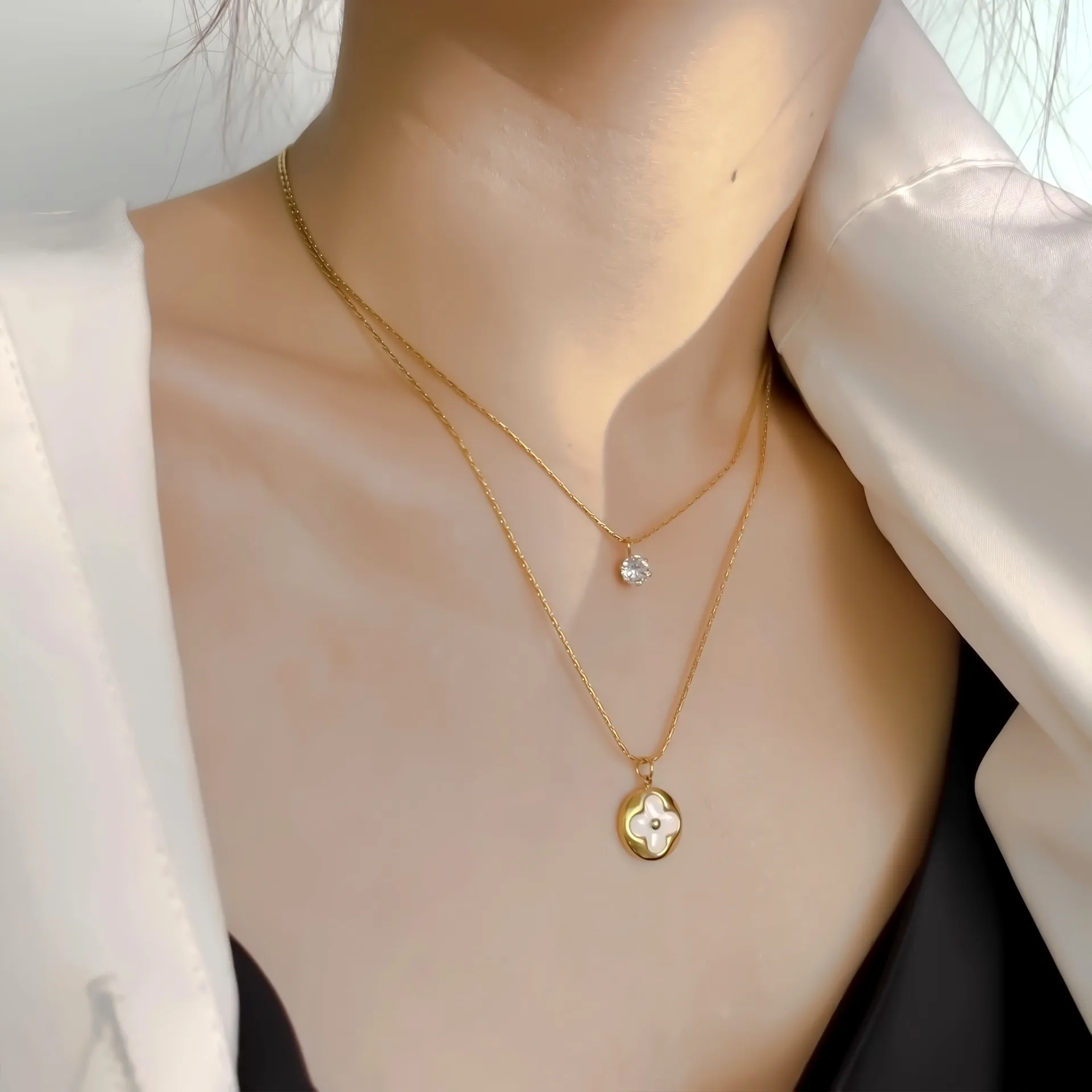 Κολιέ για κάθε περίσταση & κάθε ώρα της ημέρας.Διαθέτει Διακριτική Πέτρα Ζιργκόν Στην Αλυσίδα Οπου Βρισκετε Κοντά Στο Λαιμό,Και κρεμαστό Στοιχείο Με Λουλούδι Στην Δευτερη Πιο Μακρυά Αλυσίδα Του.