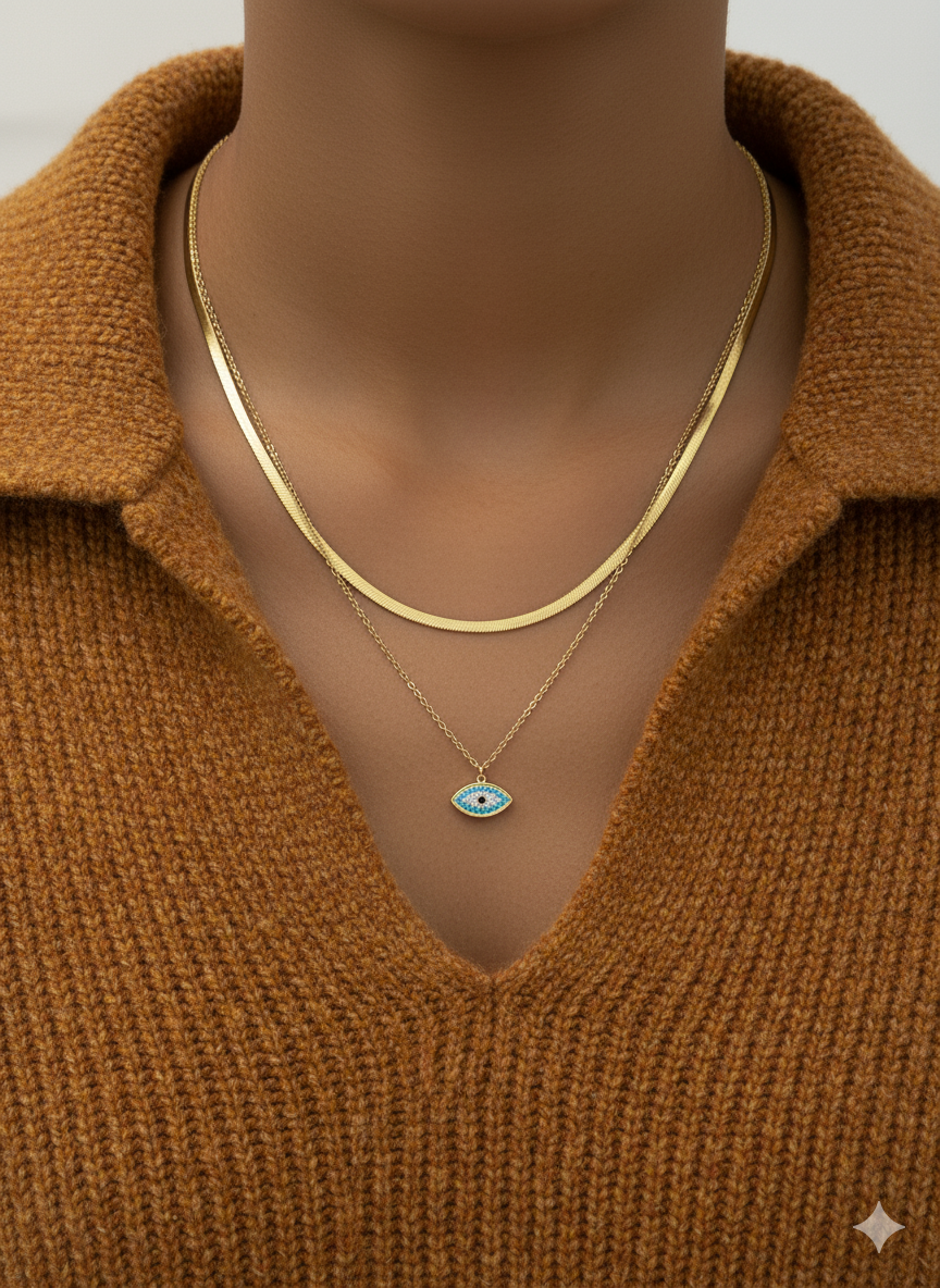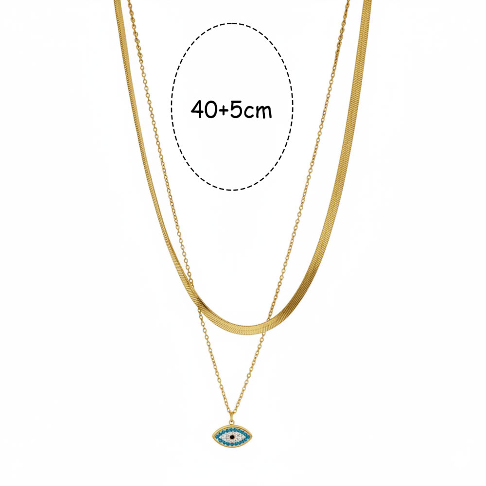 Κομψό κολιέ από ατσάλι σε διπλή αλυσίδα, που συνδυάζει μια flat snake chain με μια λεπτή, κλασική αλυσίδα. Το κεντρικό στοιχείο είναι ένα εντυπωσιακό μάτι σε αποχρώσεις του τιρκουάζ και του λευκού, που προσφέρει προστασία και μοναδικό στυλ. Ανθεκτικό, αντιαλλεργικό και ιδανικό για καθημερινή χρήση ή layering με άλλα κοσμήματα. Ένα διαχρονικό κομμάτι που χαρίζει λάμψη και μοντέρνα αισθητική σε κάθε look. Μήκος Αλυσίδας: 40εκ. Προέκταση: 5 εκ.