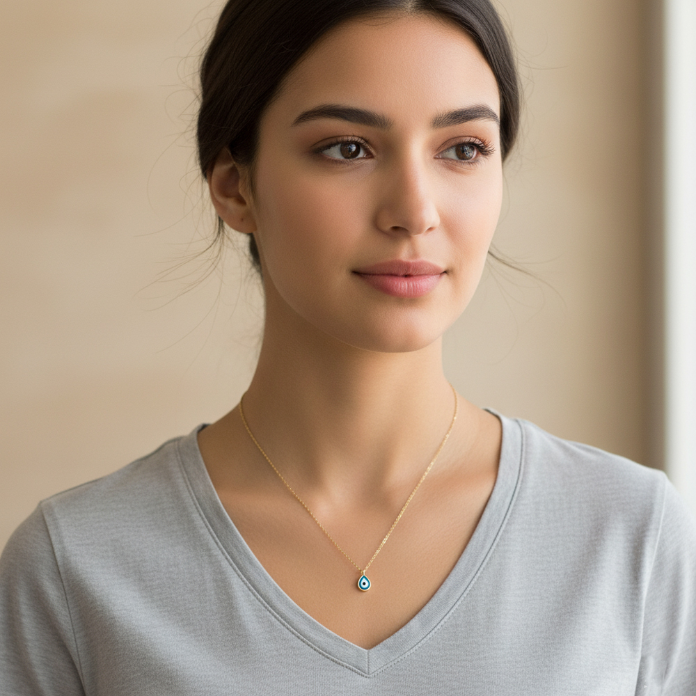 Κομψό και διακριτικό κολιέ από ανοξείδωτο ατσάλι με μοτίφ δάκρυ-μάτι. Φοριέται καθημερινά, δεν μαυρίζει και προσφέρει μια minimal πινελιά προστασίας και στυλ. Ιδανικό για layering ή ως μοναδικό statement κομμάτι.