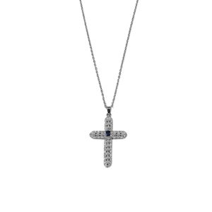 Κομψό ατσάλινο κολιέ με λαμπερό σταυρό διακοσμημένο με πέρλες και μπλε πέτρα στο κέντρο.Η λεπτή αλυσίδα από ανοξείδωτο ατσάλι προσθέτει ανθεκτικότητα και διαχρονικό στυλ, καθιστώντας το ιδανικό κόσμημα για κάθε περίσταση.Διατίθεται σε ασημί και χρυσό χρώμα.