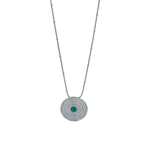 Μοναδικό κολιέ από ανοξείδωτο ατσάλι με καλλιτεχνικό κυκλικό μοτίφ και τιρκουάζ πέτρα στο κέντρο. Ο ιδιαίτερος σχεδιασμός του συνδυάζει boho αισθητική με κομψότητα, προσθέτοντας χρώμα και χαρακτήρα σε κάθε εμφάνιση. Ιδανικό κόσμημα για καθημερινή χρήση ή ως ιδιαίτερο δώρο. Μήκος Αλυσίδας: 47 εκ. Προέκταση: 5 εκ.