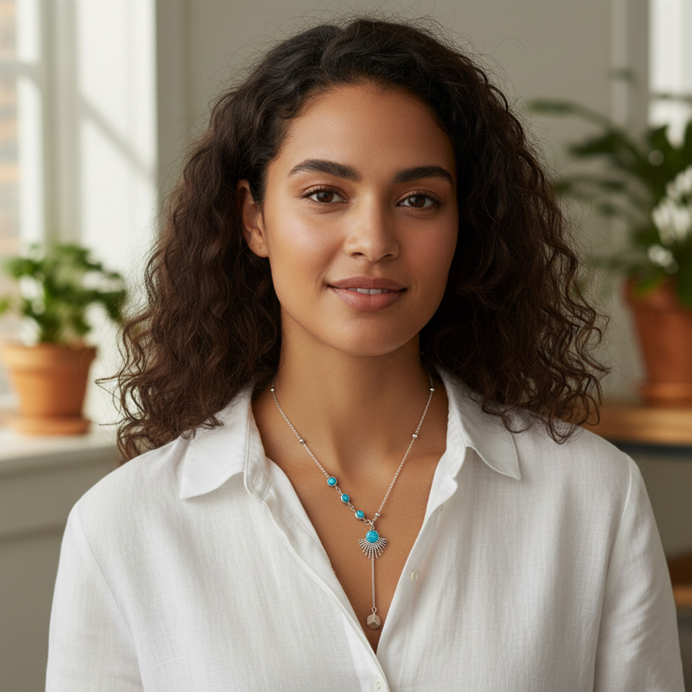 Κομψό κολιέ από ανοξείδωτο ατσάλι, διακοσμημένο με τιρκουάζ πέτρες και κεντρικό μοτίφ σε σχήμα ήλιου. Η επιμήκυνση με μεταλλικό κρεμαστό προσθέτει μοντέρνο χαρακτήρα και κίνηση στο σχέδιο. Ένα ιδιαίτερο boho-chic κόσμημα που χαρίζει χρώμα και στυλ σε κάθε εμφάνιση, ιδανικό για καθημερινή χρήση ή ως δώρο. Μήκος Αλυσίδας: 41 εκ. Προέκταση: 5 εκ.