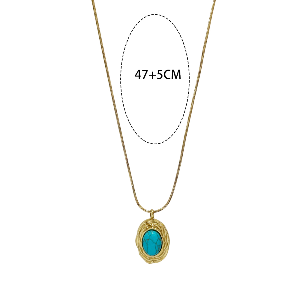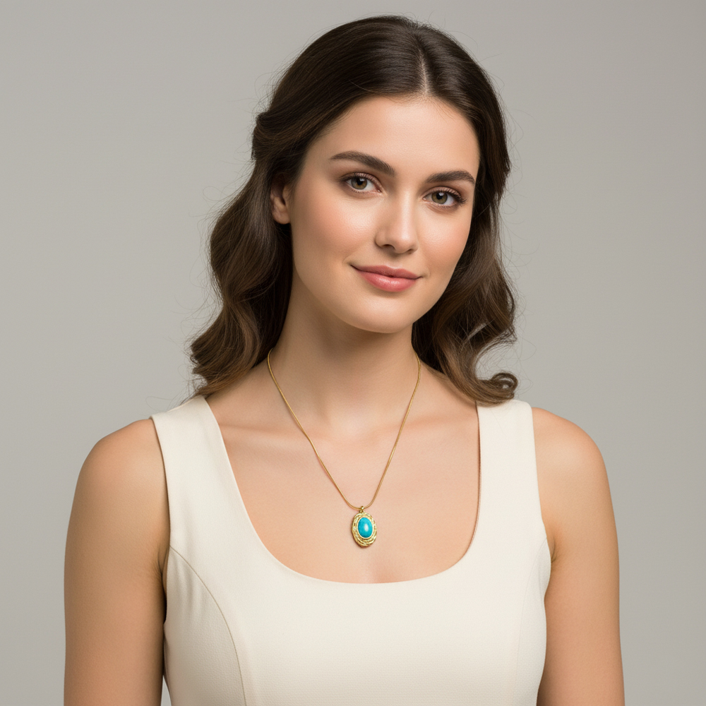 Κομψό κολιέ από ανοξείδωτο ατσάλι με οβάλ τιρκουάζ πέτρα σε περίτεχνο χρυσό πλαίσιο. Η έντονη απόχρωση της πέτρας δίνει boho χαρακτήρα, ενώ ο μίνιμαλ σχεδιασμός του το καθιστά ιδανικό για καθημερινή χρήση. Ένα ιδιαίτερο κόσμημα που προσθέτει χρώμα και στυλ σε κάθε εμφάνιση.