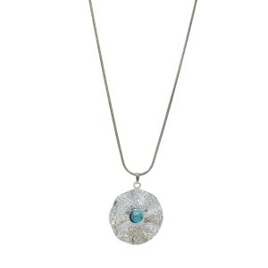 Κομψό κολιέ από ανοξείδωτο ατσάλι με εντυπωσιακό σφυρήλατο κεντρικό μοτίφ και τιρκουάζ πέτρα στο κέντρο. Ο μοναδικός συνδυασμός υφής και χρώματος προσδίδει boho αλλά ταυτόχρονα εκλεπτυσμένο χαρακτήρα. Ένα ιδιαίτερο κόσμημα που αναδεικνύει κάθε εμφάνιση, ιδανικό για καθημερινή χρήση ή ως δώρο. Μήκος Αλυσίδας: 47 εκ. Προέκταση: 5 εκ.