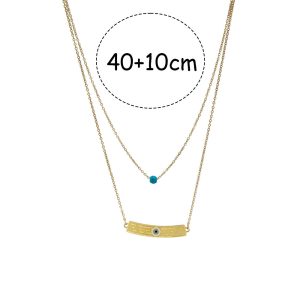 Κομψό κολιέ από ατσάλι σε διπλή σειρά, ιδανικό για μοντέρνο layering χωρίς προσπάθεια. Η πρώτη σειρά διαθέτει μια μικρή τιρκουάζ χάντρα, ενώ η δεύτερη ξεχωρίζει με μια χρυσή μπάρα διακοσμημένη με μοτίβο και ένα διακριτικό ματάκι στο κέντρο. Ανθεκτικό, αντιαλλεργικό και ιδιαίτερα στιλάτο, αποτελεί την τέλεια επιλογή για καθημερινές εμφανίσεις αλλά και ως ξεχωριστό δώρο.