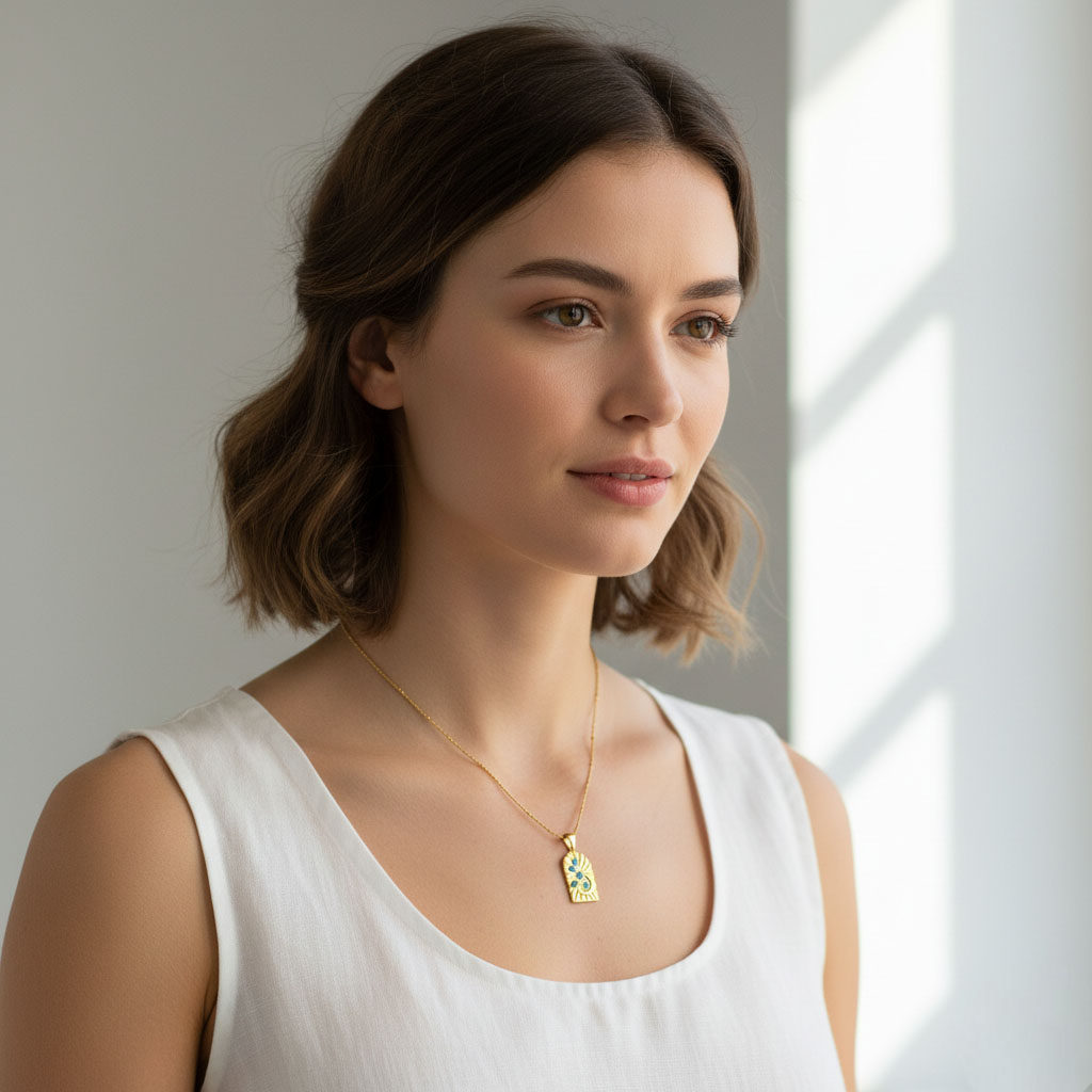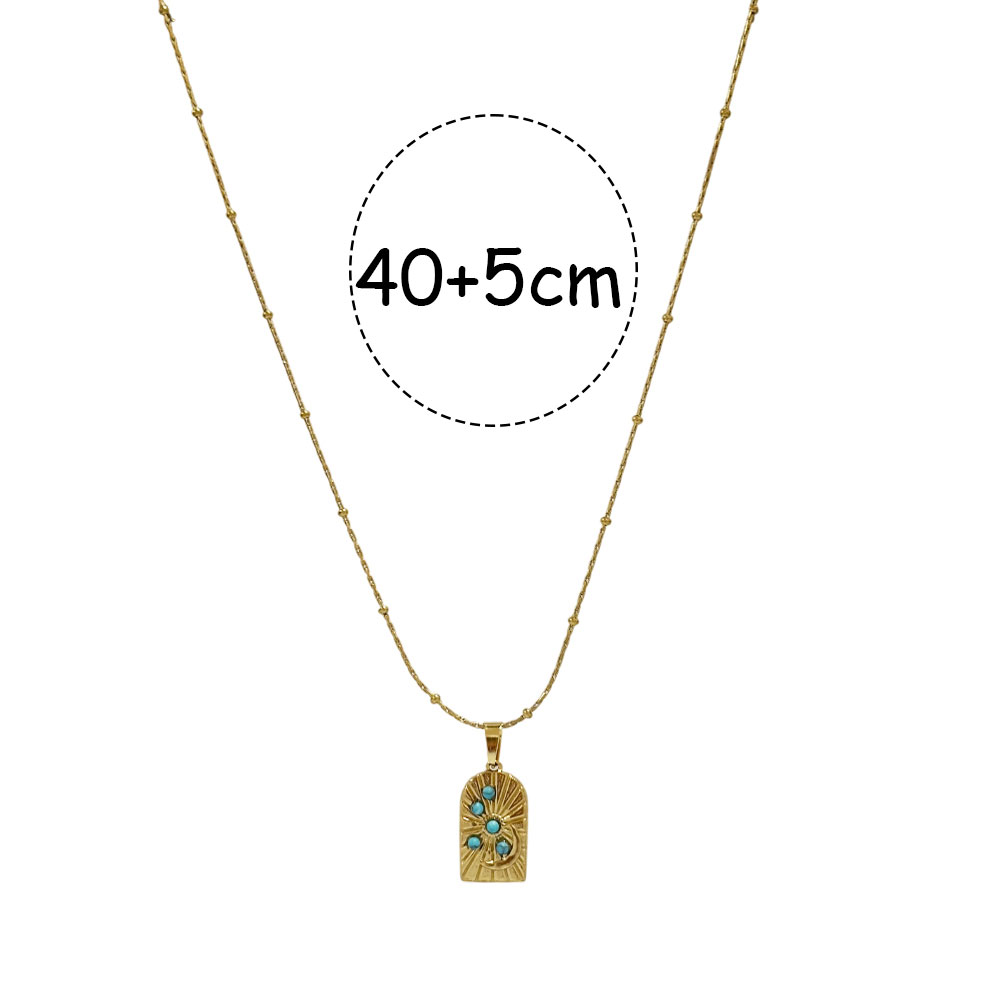 Απογειώστε το στυλ σας με αυτό το κομψό κολιέ από ατσάλι, ιδανικό για καθημερινή χρήση αλλά και πιο ιδιαίτερες εμφανίσεις. Το χρυσό μενταγιόν διαθέτει χαραγμένες λεπτομέρειες και μικρές τιρκουάζ πέτρες που προσθέτουν μια διακριτική, boho πινελιά. Ανθεκτικό, αντιαλλεργικό και διαχρονικό, αποτελεί την τέλεια επιλογή για δώρο ή για να συμπληρώσει τη δική σας συλλογή. Μήκος Αλυσίδας: 40εκ. Προέκταση: 5 εκ.