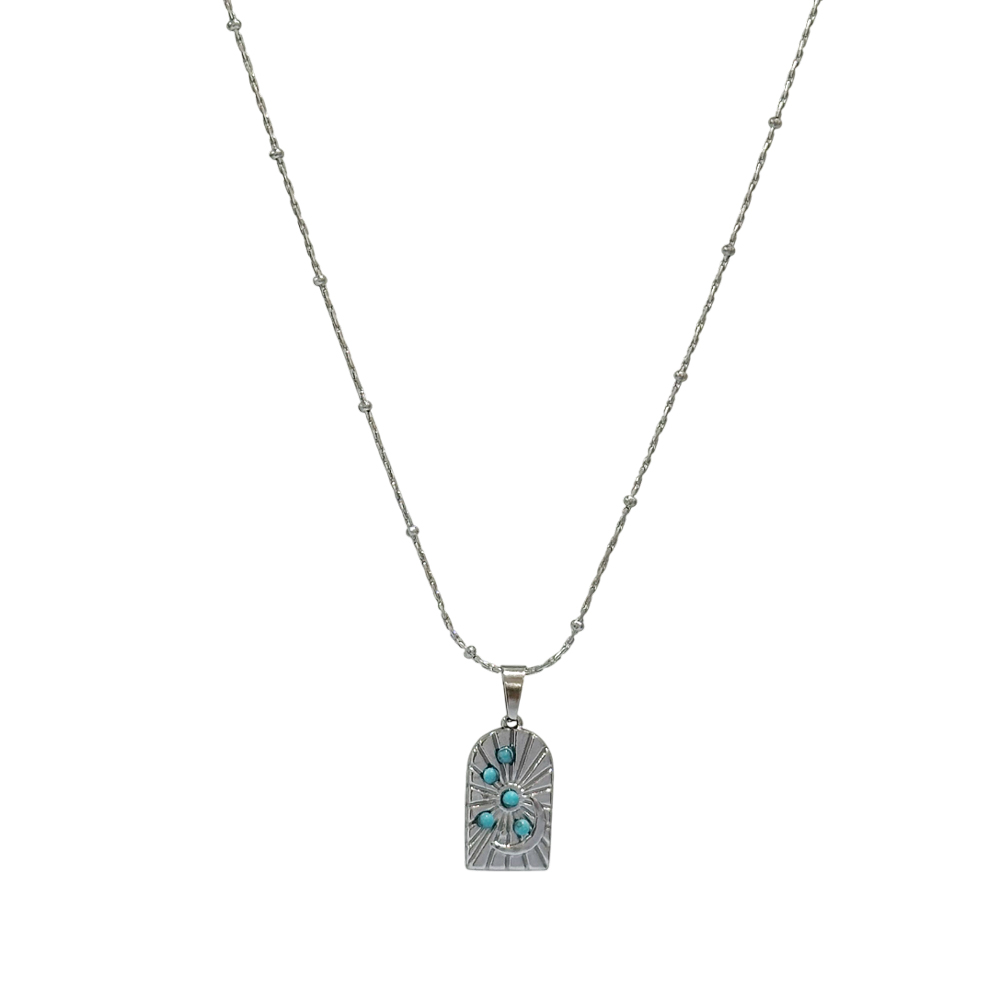 Απογειώστε το στυλ σας με αυτό το κομψό κολιέ από ατσάλι, ιδανικό για καθημερινή χρήση αλλά και πιο ιδιαίτερες εμφανίσεις. Το χρυσό μενταγιόν διαθέτει χαραγμένες λεπτομέρειες και μικρές τιρκουάζ πέτρες που προσθέτουν μια διακριτική, boho πινελιά. Ανθεκτικό, αντιαλλεργικό και διαχρονικό, αποτελεί την τέλεια επιλογή για δώρο ή για να συμπληρώσει τη δική σας συλλογή.