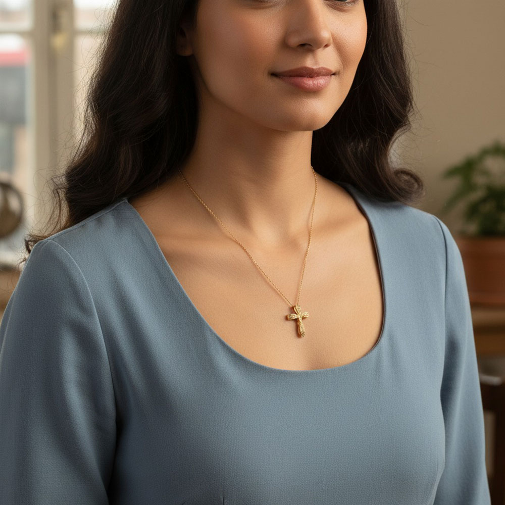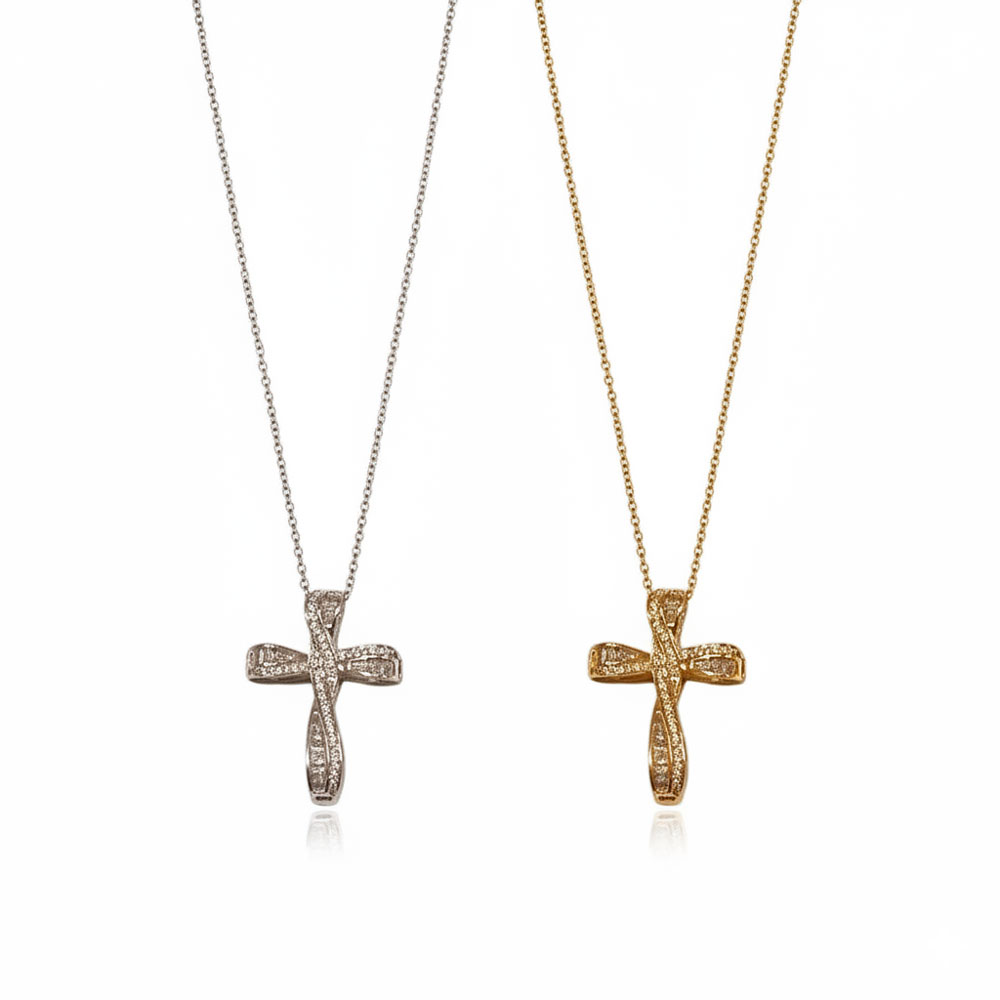 Κομψό και διακριτικό κολιέ με ατσάλινη αλυσίδα και σταυρό διακοσμημένο με λαμπερές πέτρες ζιργκόν. Ο σταυρός δεν είναι από ατσάλι, όμως χαρίζει εκλεπτυσμένη λάμψη και θηλυκότητα σε κάθε εμφάνιση.Η ατσάλινη αλυσίδα είναι ανθεκτική, υποαλλεργική και δεν μαυρίζει, ιδανική για καθημερινή χρήση ή για elegant συνδυασμούς.Διατίθεται σε δύο αποχρώσεις — ασημί και χρυσό — για να επιλέξεις αυτή που ταιριάζει καλύτερα στο προσωπικό σου στυλ.