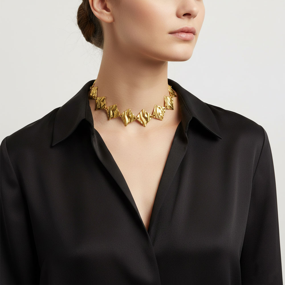 Εντυπωσιακό ατσάλινο κολιέ με γεωμετρικά διακοσμητικά στοιχεία και ανάγλυφη υφή που προσδίδει ιδιαίτερο χαρακτήρα στο κόσμημα. Ο μοντέρνος σχεδιασμός του δημιουργεί ένα statement αποτέλεσμα, ιδανικό για εμφανίσεις που ξεχωρίζουν. Κατασκευασμένο από ανοξείδωτο ατσάλι, προσφέρει ανθεκτικότητα, σταθερότητα και άνετη εφαρμογή. Ένα δυναμικό κόσμημα που μπορεί να φορεθεί μόνο του και να αποτελέσει το επίκεντρο κάθε outfit.