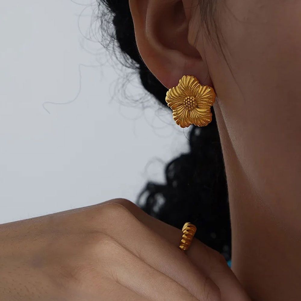 Σκουλαρίκια από ανοξείδωτο ατσάλι με ανάγλυφο σχέδιο λουλουδιού και έντονες γραμμές που δημιουργούν βάθος και υφή. Η συμμετρική, οργανική τους φόρμα αποπνέει κομψότητα και διαχρονική αισθητική, ενώ το sculpted design τα καθιστά ιδανικά για ολοκληρωμένες και προσεγμένες εμφανίσεις. Ελαφριά και άνετα στο αυτί, φοριούνται εύκολα καθημερινά αλλά και σε πιο ιδιαίτερες περιστάσεις, προσθέτοντας χαρακτήρα και ισορροπία στο look. Υλικό:Ατσάλι
