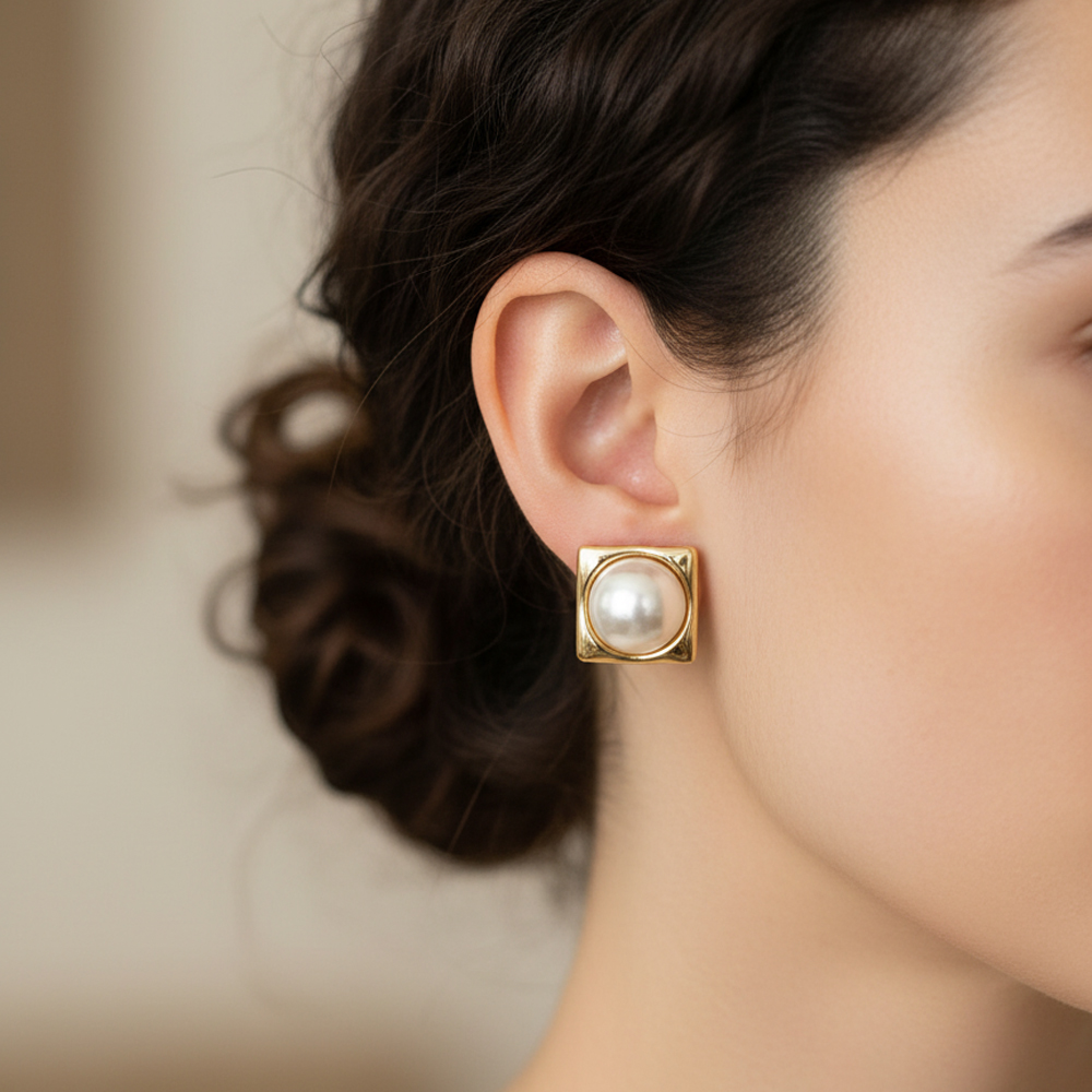 Κομψά ατσάλινα σκουλαρίκια με πέρλες σε τετράγωνη χρυσή βάση. Ο εκλεπτυσμένος σχεδιασμός τους συνδυάζει τη διαχρονική ομορφιά της πέρλας με τη μοντέρνα λάμψη του μετάλλου, προσφέροντας ένα αποτέλεσμα κομψό και θηλυκό. Ιδανικά για καθημερινές αλλά και βραδινές εμφανίσεις, χαρίζουν στυλ και φινέτσα σε κάθε σύνολο. Κατασκευασμένα από ανοξείδωτο ατσάλι, ανθεκτικά και υποαλλεργικά.