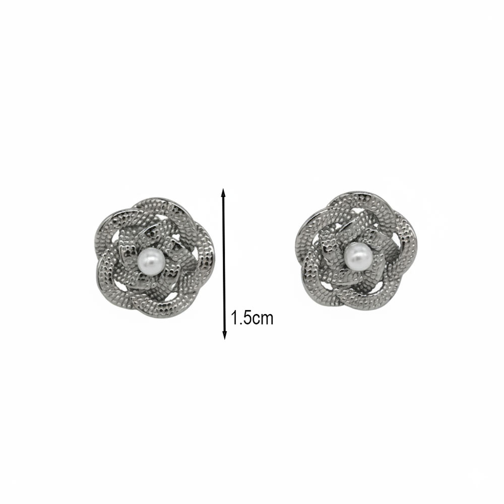 Αυτά τα κομψά σκουλαρίκια από ατσάλι ξεχωρίζουν χάρη στο πλεκτό, περίτεχνο σχέδιό τους που σχηματίζει ένα λουλούδι με υφή, ενώ η διακριτική πέρλα στο κέντρο προσθέτει μια elegant και φωτεινή πινελιά· με διάμετρο περίπου 1.5cm, είναι άνετα, ελαφριά και ιδανικά για καθημερινές αλλά και πιο ιδιαίτερες εμφανίσεις, προσφέροντας διαχρονική αντοχή και ένα refined αποτέλεσμα που ολοκληρώνει κάθε look.