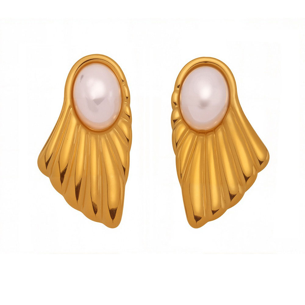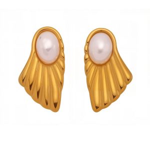 Σκουλαρίκια Ατσάλι Πέρλα σε Ανάγλυφο Κύμα – Χρυσό