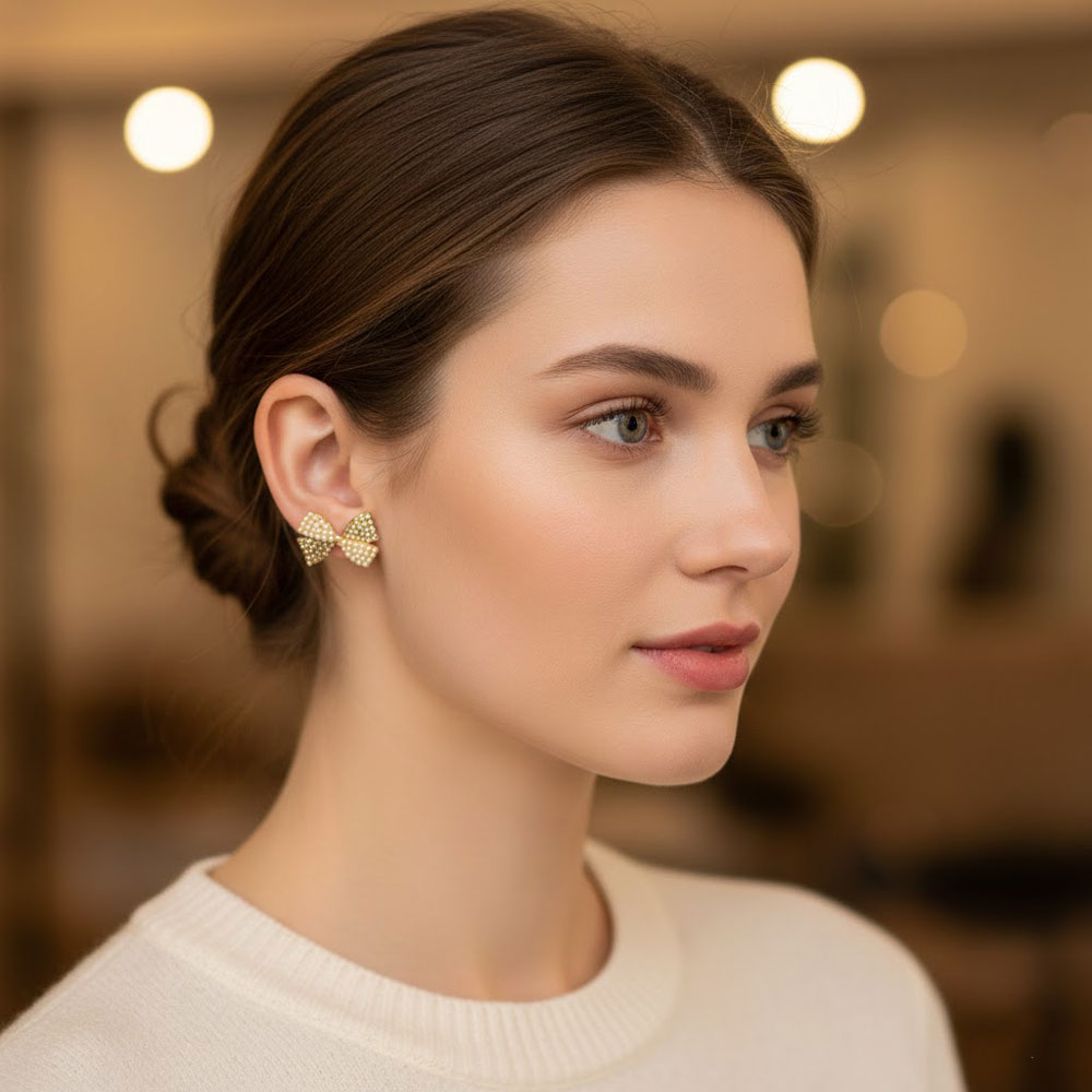 Κομψά σκουλαρίκια φιόγκος με εντυπωσιακό συνδυασμό περλών και λαμπερών στρας, ιδανικά για να αναδείξουν κάθε εμφάνιση. Το διαχρονικό τους design προσφέρει μια θηλυκή και elegant πινελιά, ενώ το χρυσό τους φινίρισμα προσθέτει φωτεινότητα και πολυτέλεια.Ελαφριά και άνετα, μπορούν να φορεθούν τόσο στην καθημερινότητα όσο και σε ιδιαίτερες περιστάσεις, ολοκληρώνοντας το outfit με μια διακριτική αλλά εντυπωσιακή λάμψη.