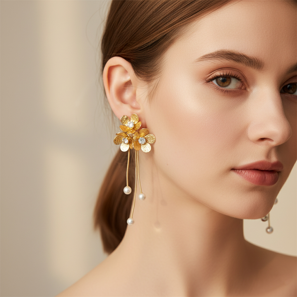 Εντυπωσιακά ατσάλινα σκουλαρίκια σε σχήμα λουλουδιού, διακοσμημένα με λαμπερούς κρυστάλλους στο κέντρο και πέρλες στις άκρες. Ο συνδυασμός της σφυρήλατης χρυσής υφής με τις λεπτές μεταλλικές απολήξεις χαρίζει ένα εκλεπτυσμένο και θηλυκό αποτέλεσμα. Ιδανικά για ιδιαίτερες περιστάσεις ή βραδινές εμφανίσεις, προσθέτουν λάμψη, κίνηση και κομψότητα σε κάθε στυλ. Ανθεκτικά, υποαλλεργικά και μοναδικά.