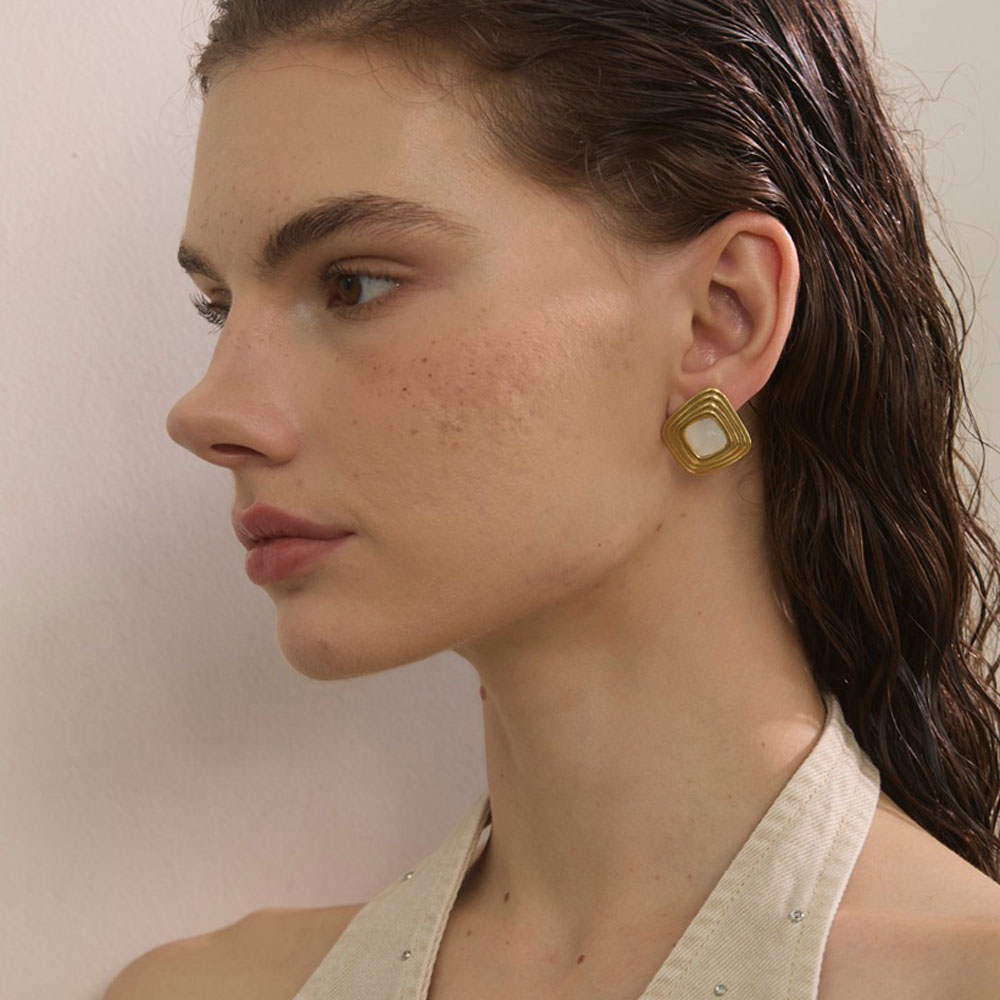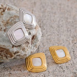 Κομψά καρφωτά σκουλαρίκια από ανοξείδωτο ατσάλι με μοντέρνο γεωμετρικό σχεδιασμό και ένθετο φυσικό φίλντισι που προσθέτει διακριτική λάμψη και φυσική κομψότητα. Ο πολυεπίπεδος μεταλλικός σκελετός αγκαλιάζει αρμονικά το φίλντισι, δημιουργώντας ένα statement κόσμημα με elegant και σύγχρονο χαρακτήρα. Ιδανικά για καθημερινή χρήση αλλά και για πιο προσεγμένες εμφανίσεις, συνδυάζονται εύκολα με minimal ή chic σύνολα.