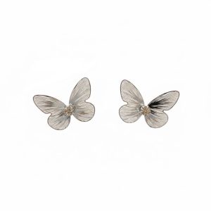 Κομψά σκουλαρίκια πεταλούδα από ανοξείδωτο ατσάλι σε ασημί χρώμα, με λεπτομέρειες στυλ σύρμα και λαμπερή λευκή πέτρα στο κέντρο. Το διακριτικό τους σχέδιο χαρίζει κομψότητα και φινέτσα, ολοκληρώνοντας ιδανικά τόσο καθημερινές όσο και πιο ιδιαίτερες εμφανίσεις. Ελαφριά, ανθεκτικά και υποαλλεργικά για άνετη χρήση όλη την ημέρα.