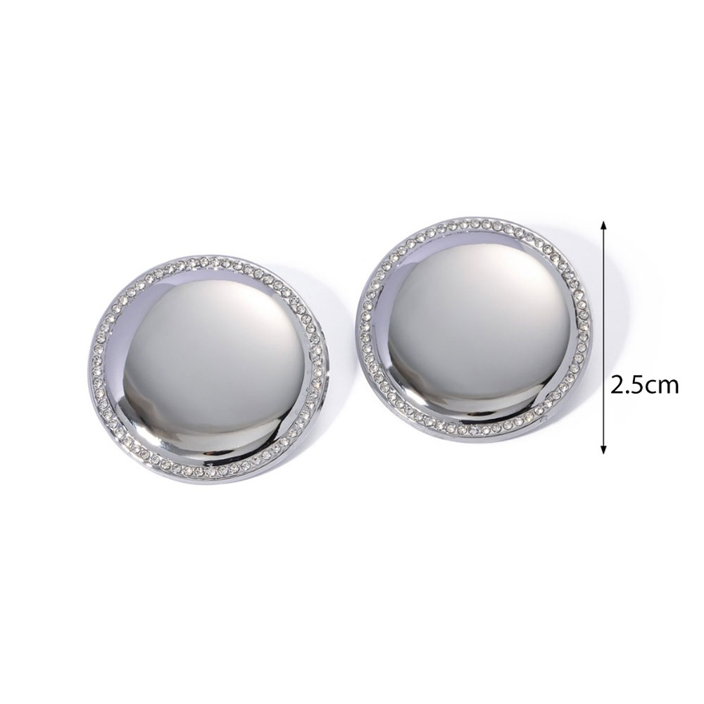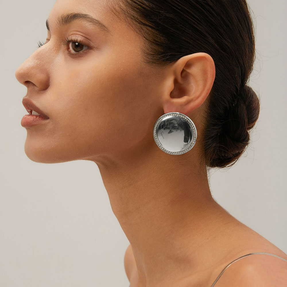 Κομψά στρογγυλά σκουλαρίκια από ανοξείδωτο ατσάλι με εντυπωσιακό καθρέφτη–φινίρισμα στο κέντρο και διακριτική διακόσμηση από λαμπερά κρύσταλλα περιμετρικά. Το statement σχέδιό τους προσθέτει άμεση λάμψη και πολυτέλεια σε κάθε εμφάνιση, ενώ παραμένουν ελαφριά και άνετα για πολύωρη χρήση. Ιδανικά για επίσημες περιστάσεις ή για να αναβαθμίσουν κομψά ένα minimal look.