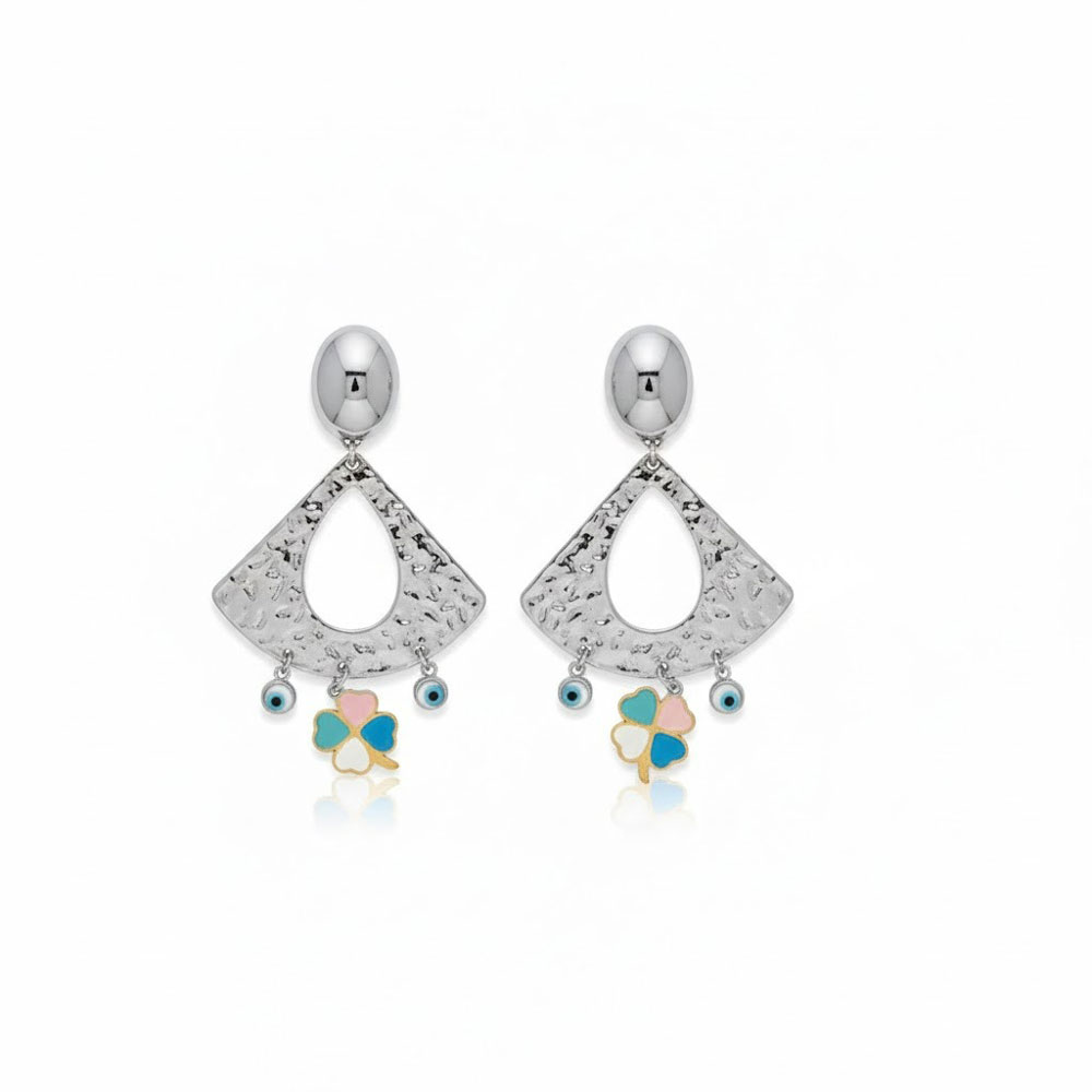 Κρεμαστά ατσάλινα σκουλαρίκια με σφυρήλατη σταγόνα, διακοσμημένα με μάτι και χρωματιστό τριφύλλι που συμβολίζουν προστασία και τύχη. Ένα ιδιαίτερο κόσμημα που προσθέτει χρώμα και χαρακτήρα σε κάθε εμφάνιση.