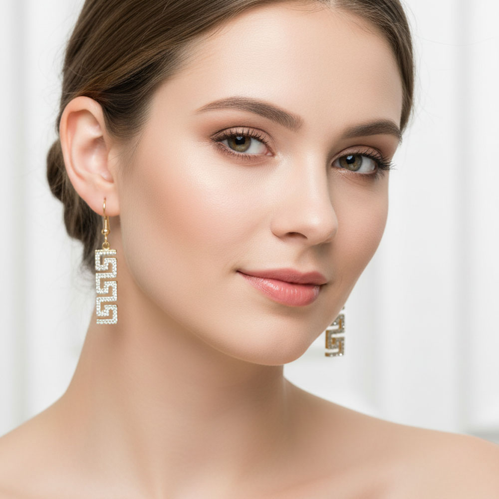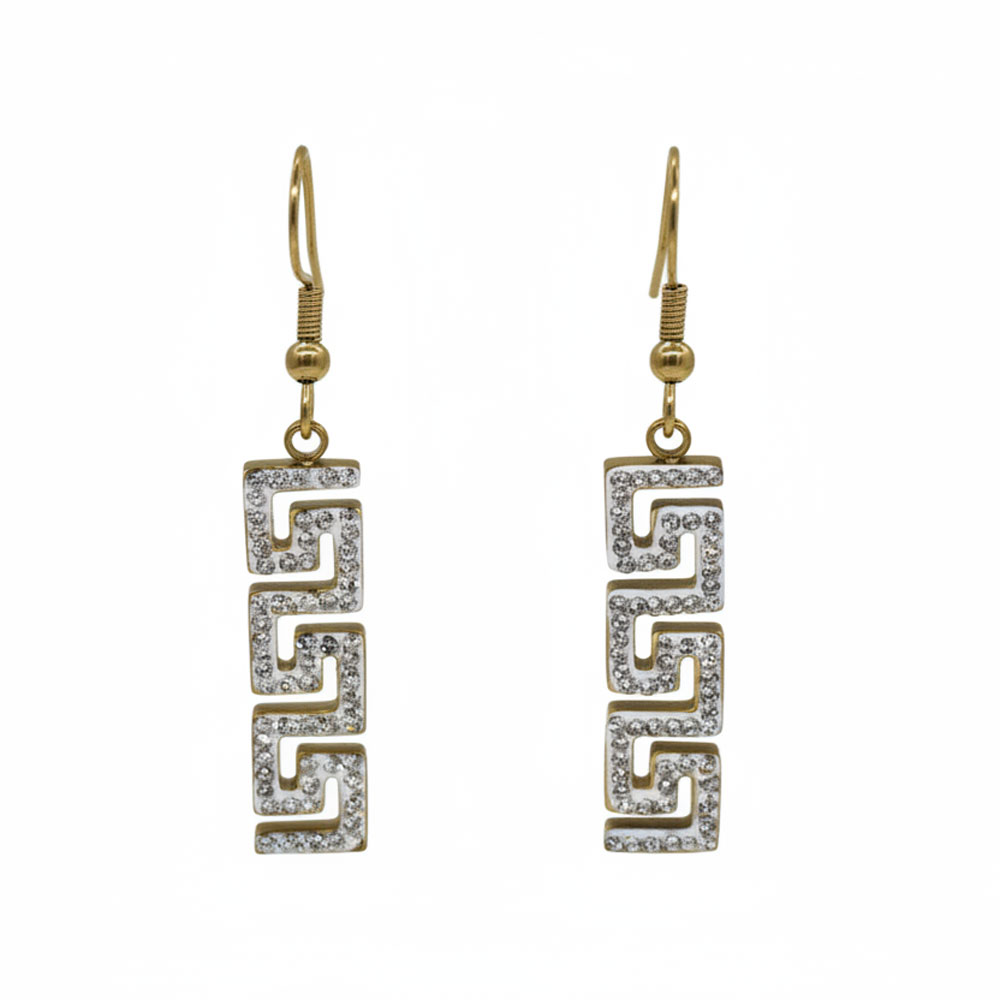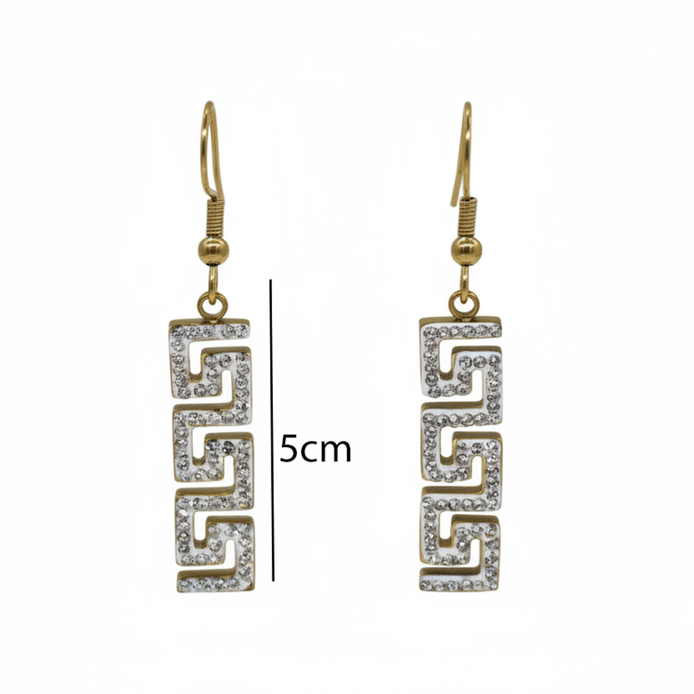 Κομψά σκουλαρίκια από ανοξείδωτο ατσάλι, διακοσμημένα με κάθετο μοτίβο μαίανδρου και λαμπερά στρας που προσφέρουν έντονη λάμψη και σύγχρονο χαρακτήρα. Με μήκος περίπου 5 cm, δημιουργούν εντυπωσιακή κίνηση και αναδεικνύουν κάθε εμφάνιση, από βραδινή έως πιο minimal chic. Ελαφριά και άνετα στην εφαρμογή, αποτελούν ιδανική επιλογή για όσες αναζητούν κομψότητα με statement λεπτομέρειες.