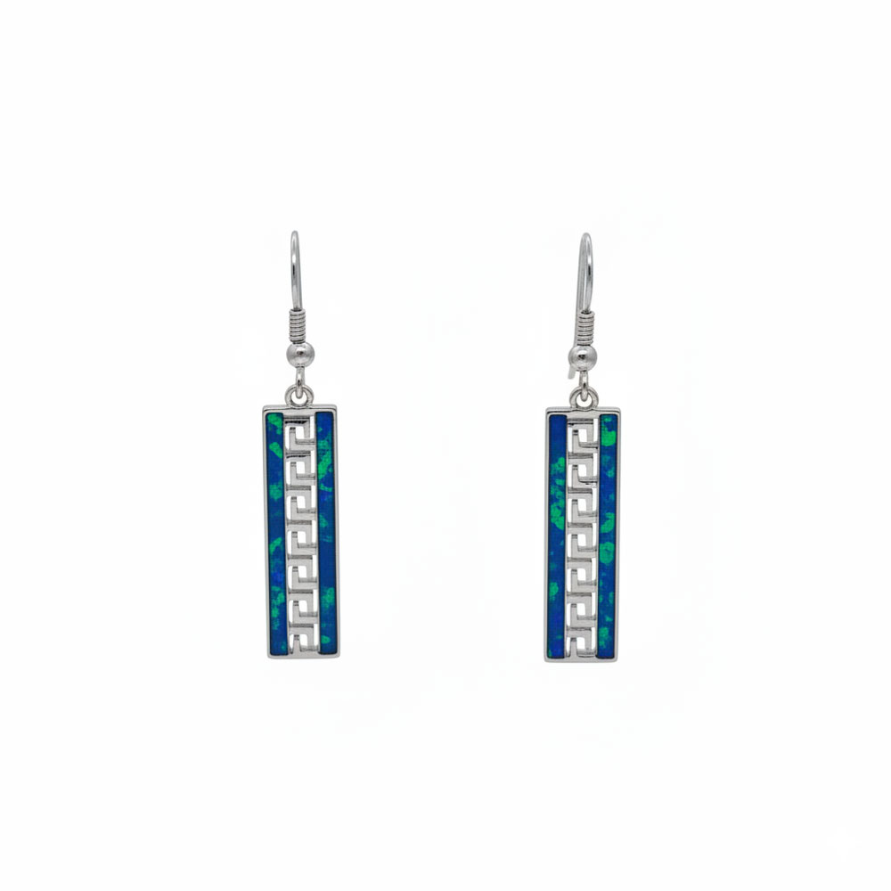 Σκουλαρίκια Ατσάλι Μακρόστενα με Σχέδιο Μαίανδρο & Μπλε Λεπτομέρειες – Ασημί