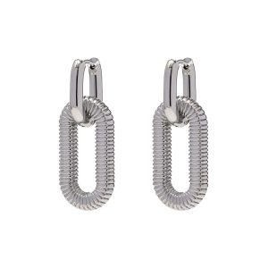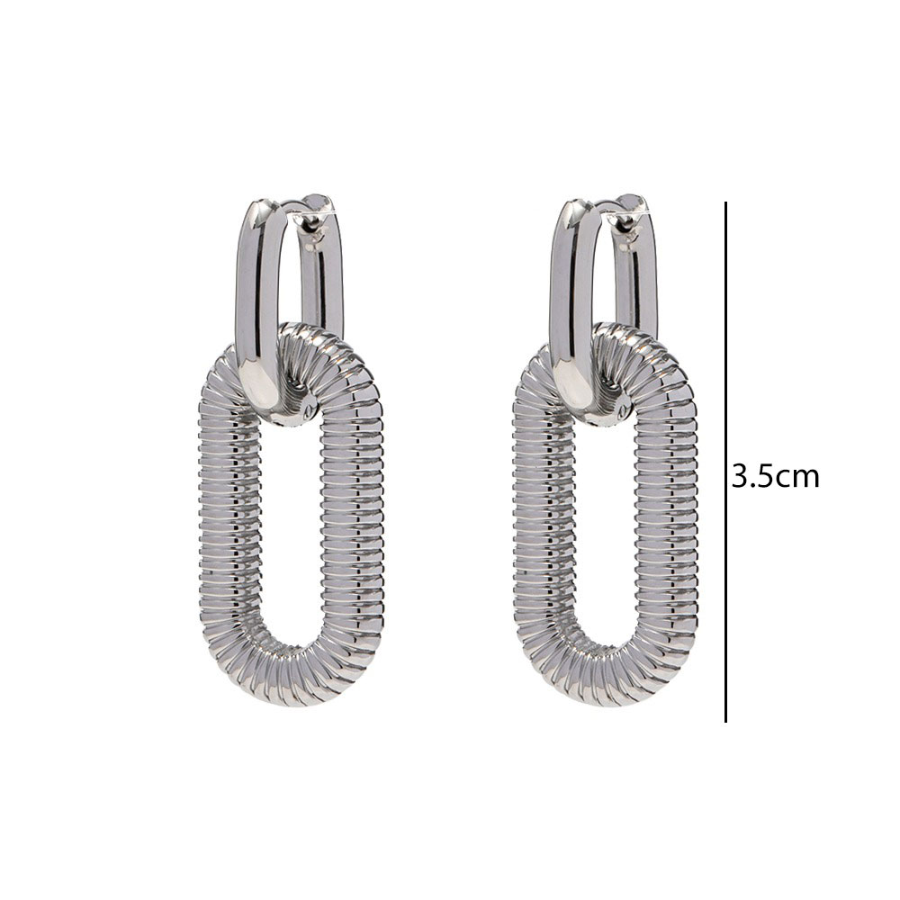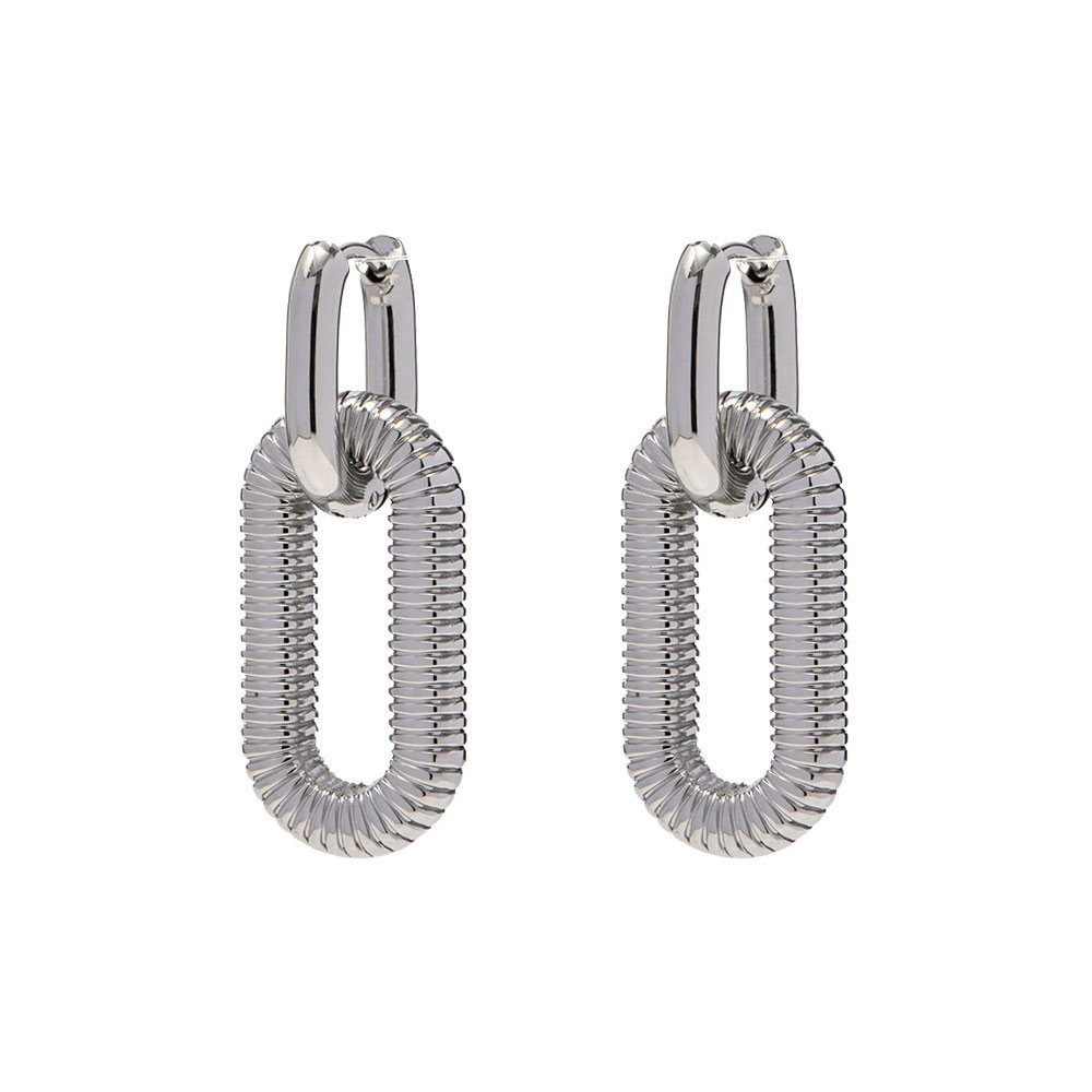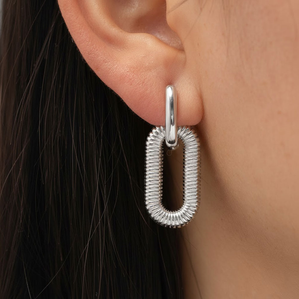 Μοντέρνα και εντυπωσιακά σκουλαρίκια από ανοξείδωτο ατσάλι με ιδιαίτερο οβάλ κρεμαστό σχέδιο τύπου κρίκου. Ο κομψός συνδυασμός των λείων και των σπειροειδών λεπτομερειών τους προσφέρει μοναδική υφή και στυλ που ξεχωρίζει. Ιδανικά για καθημερινές εμφανίσεις αλλά και πιο ιδιαίτερες περιστάσεις, καθώς προσδίδουν μια δυναμική και σύγχρονη αισθητική. Υποαλλεργικά, ανθεκτικά και άνετα στη χρήση.