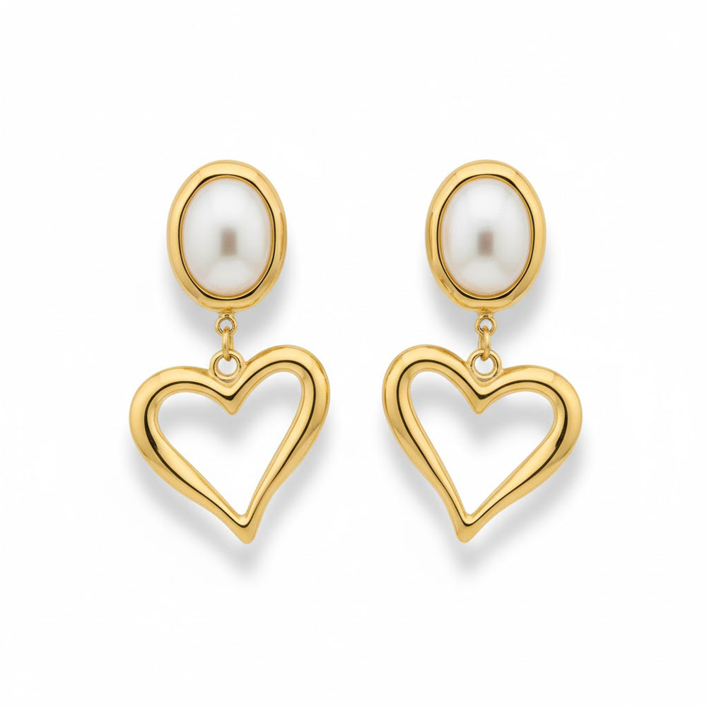 Κομψά σκουλαρίκια από ανοξείδωτο ατσάλι, με εντυπωσιακή κρεμαστή καρδιά και επάνω στοιχείο διακοσμημένο με πέτρα πέρλας. Ο μοντέρνος σχεδιασμός συνδυάζει τη μεταλλική λάμψη με την κομψότητα της pearl stone, δημιουργώντας ένα διαχρονικό και θηλυκό κόσμημα που ολοκληρώνει κάθε εμφάνιση.