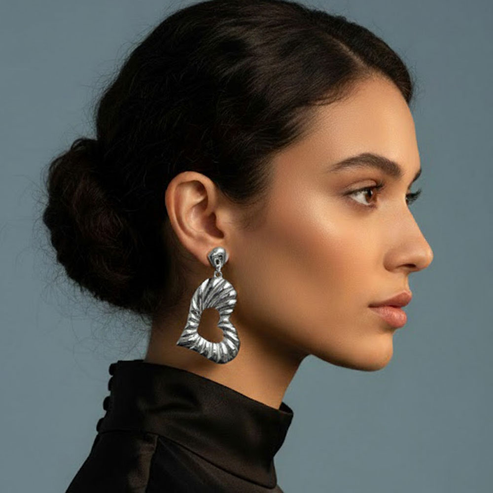 Κομψά κρεμαστά σκουλαρίκια σε σχήμα καρδιάς με σφυρήλατη υφή, που χαρίζουν λάμψη και χαρακτήρα σε κάθε εμφάνιση. Ιδανικά για καθημερινό αλλά και πιο elegant styling.