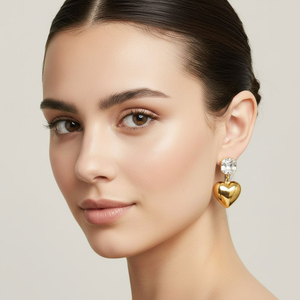 Ατσάλινα σκουλαρίκια με εντυπωσιακή χρυσή καρδιά και λαμπερό στρας στο επάνω μέρος, που χαρίζουν κομψή λάμψη και ρομαντικό χαρακτήρα. Ο αρμονικός σχεδιασμός τους αγκαλιάζει διακριτικά το αυτί, δημιουργώντας ένα θηλυκό και μοντέρνο αποτέλεσμα. Ελαφριά και ανθεκτικά, είναι ιδανικά τόσο για καθημερινές εμφανίσεις όσο και για πιο ιδιαίτερες περιστάσεις, ολοκληρώνοντας κάθε σύνολο με στυλ.