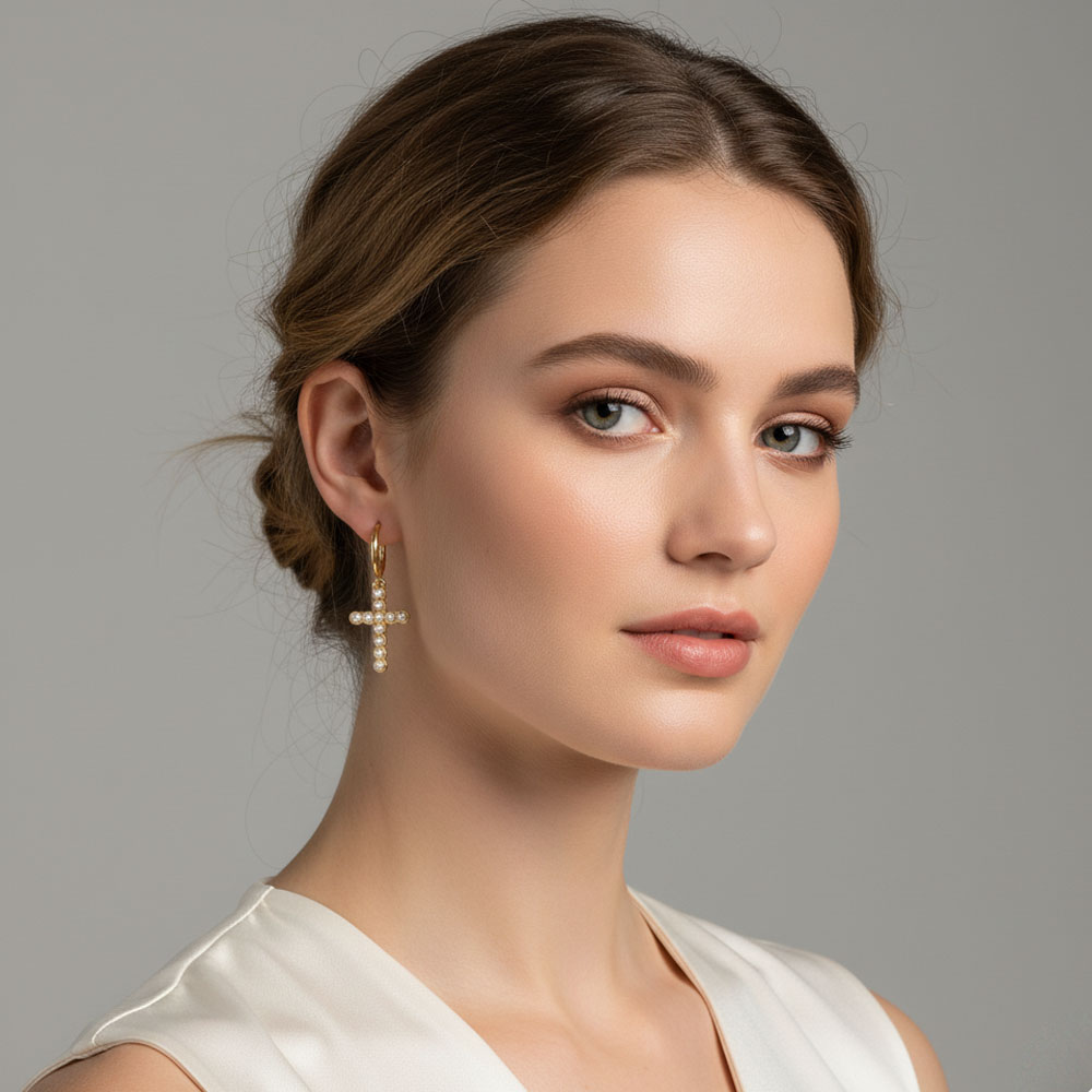 Κομψά και διαχρονικά, αυτά τα σκουλαρίκια από ατσάλι διαθέτουν κρεμαστό σταυρό διακοσμημένο με μικρές περλίτσες, προσφέροντας ένα elegant και θηλυκό αποτέλεσμα που αναδεικνύει κάθε εμφάνιση· με συνολικό μήκος περίπου 3.5cm και ελαφριά κατασκευή, φοριούνται άνετα όλη μέρα, ενώ το stainless steel εξασφαλίζει αντοχή και σταθερή λάμψη· ιδανικά τόσο για καθημερινές όσο και για πιο ιδιαίτερες περιστάσεις, διατίθενται σε χρυσό και ασημί για να ταιριάζουν σε κάθε στιλ.