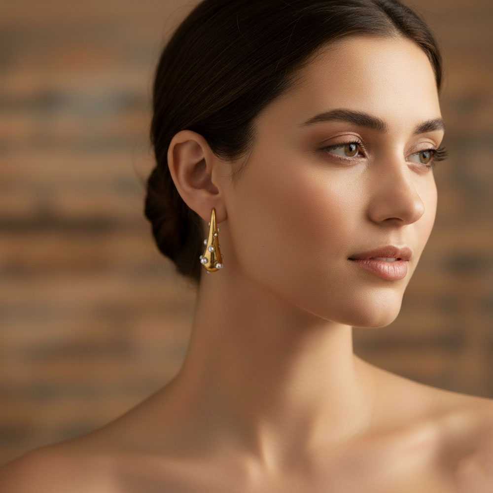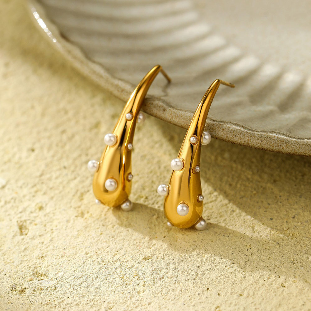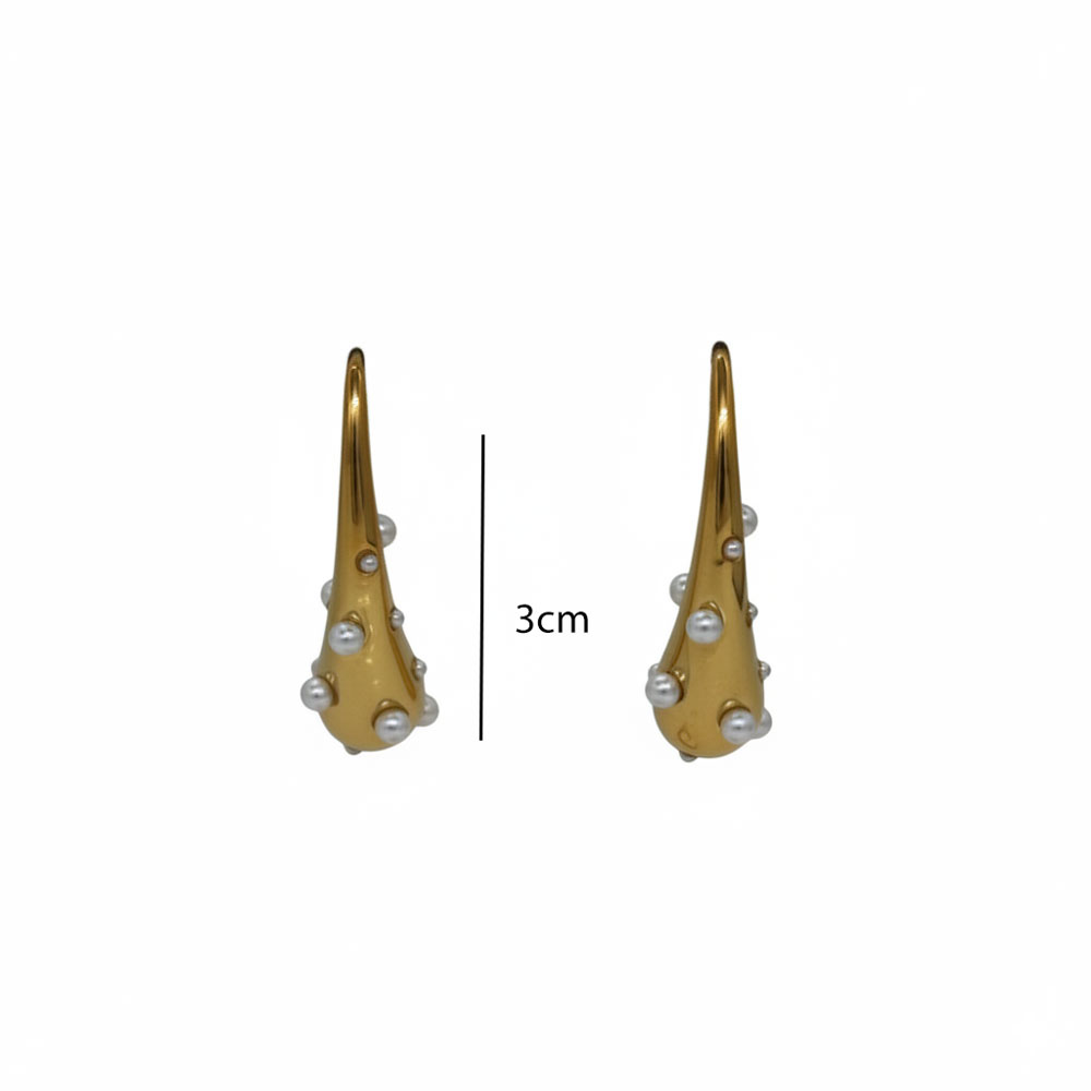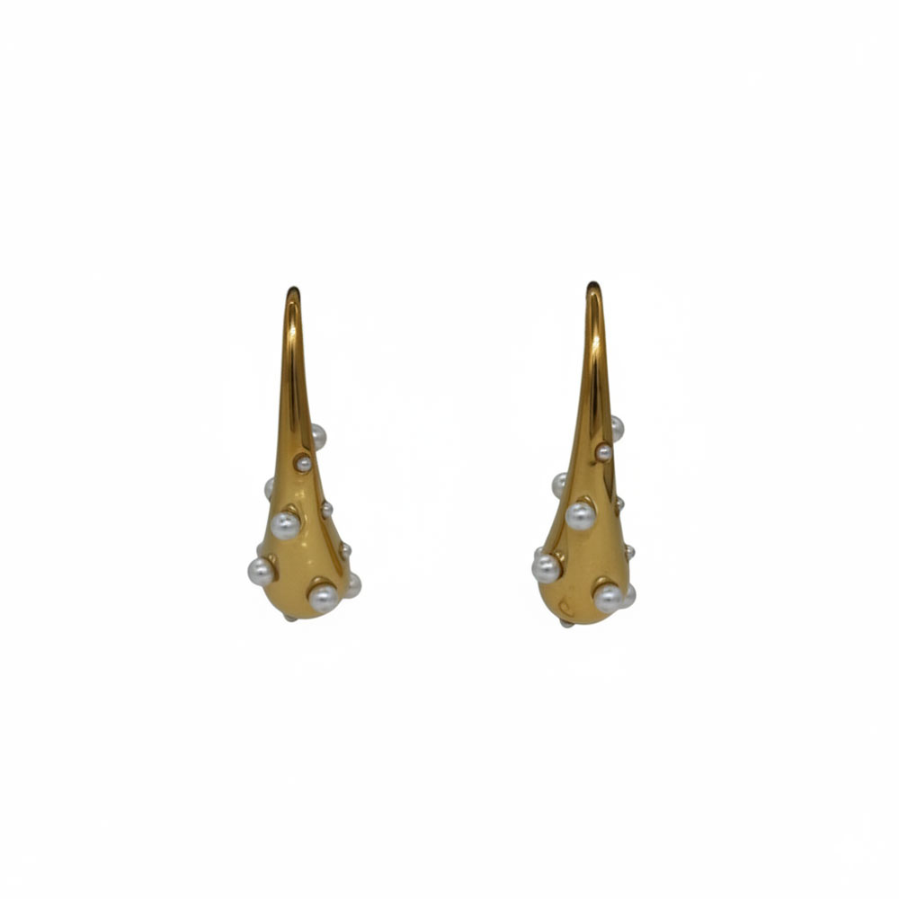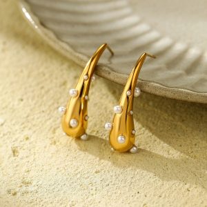 Κομψά σκουλαρίκια από ανοξείδωτο ατσάλι σε εντυπωσιακό σχέδιο δάκρυ, διακοσμημένα με μικρές λευκές πέρλες για διακριτική λάμψη. Μοντέρνα αλλά ταυτόχρονα elegant, αποτελούν την ιδανική επιλογή για καθημερινές εμφανίσεις αλλά και πιο επίσημα look. Ανθεκτικά στο νερό και στη χρήση, δεν μαυρίζουν και δεν προκαλούν αλλεργίες.