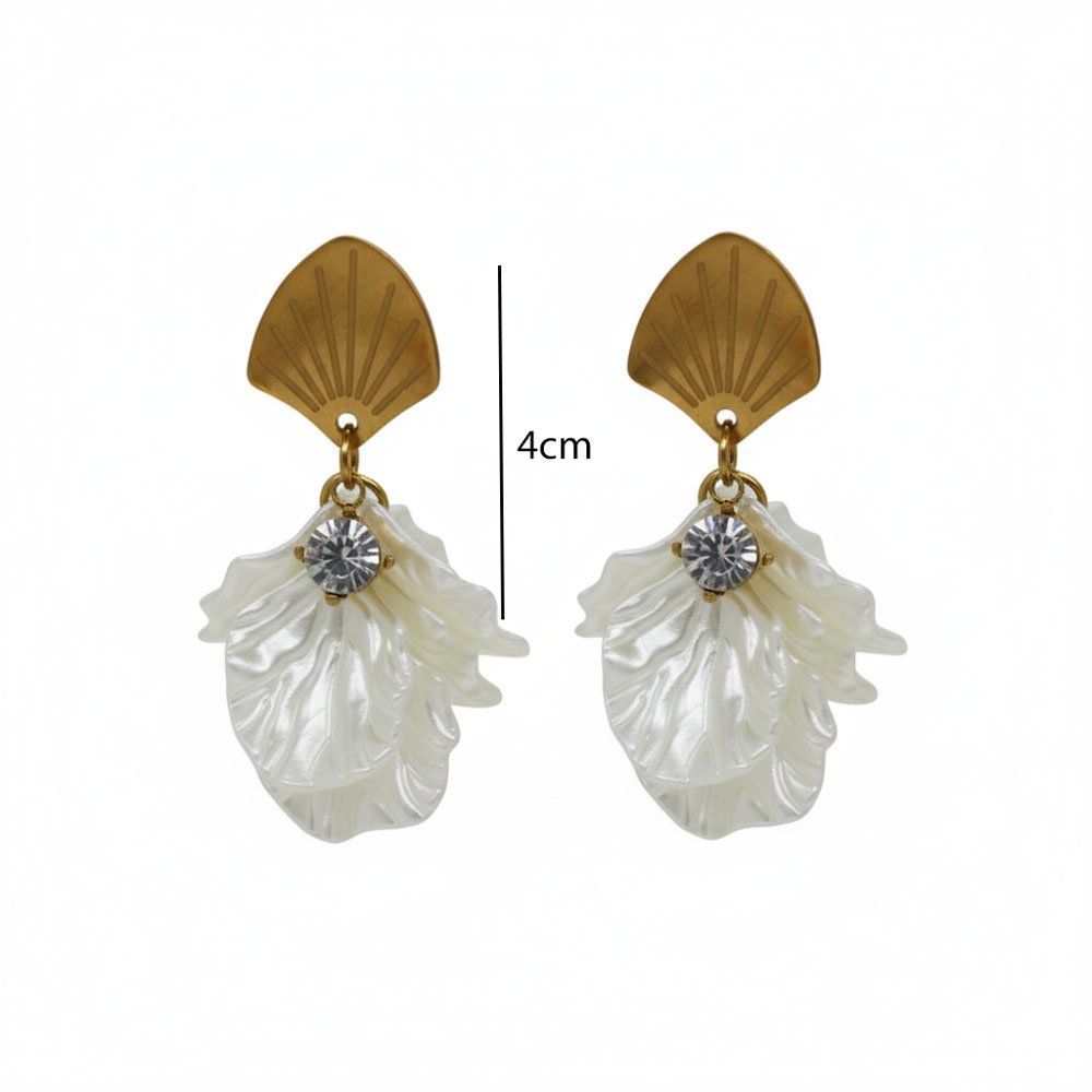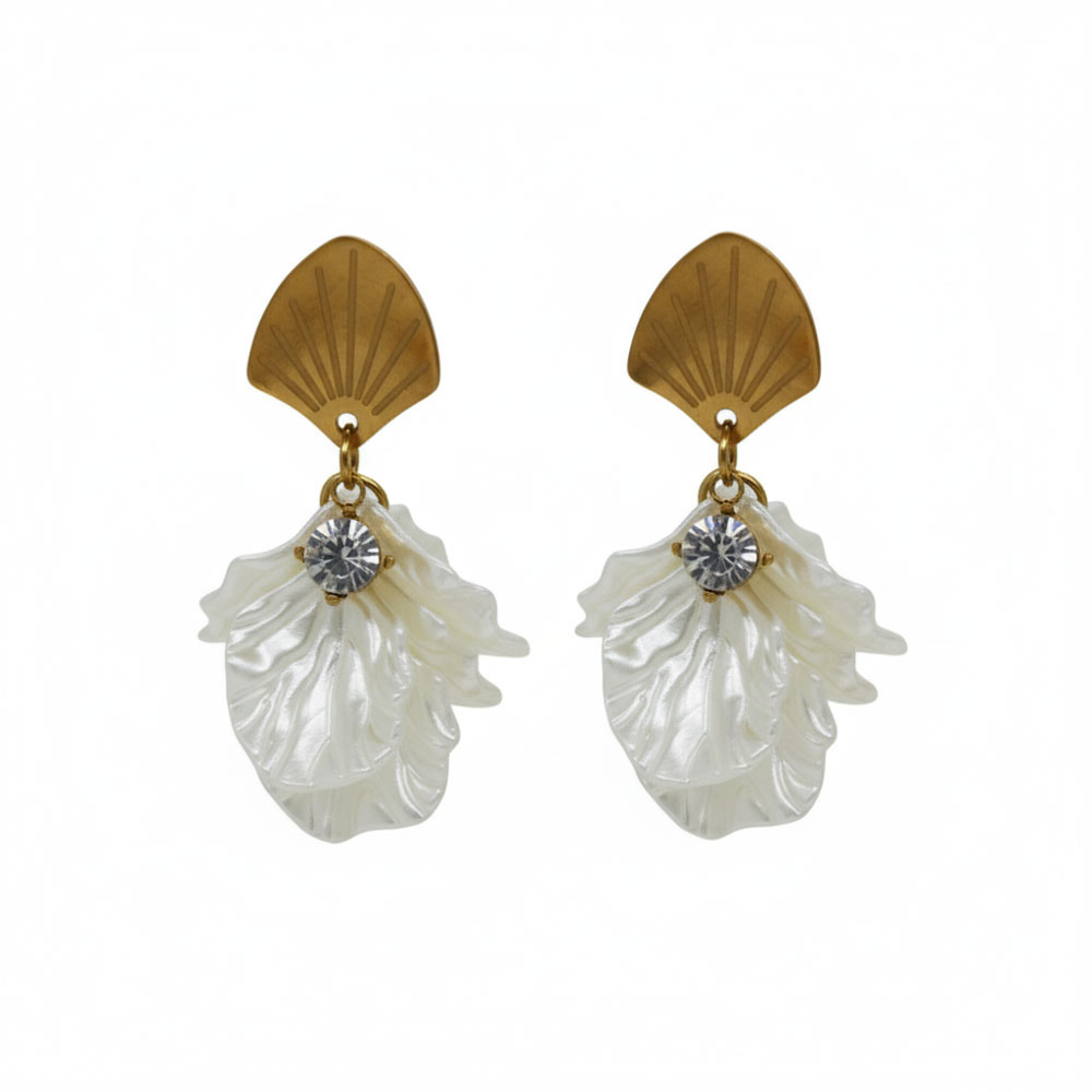 Κομψά σκουλαρίκια από ανοξείδωτο ατσάλι με μοναδικό σχέδιο όστρακου και μαργαριταρένια, ανάλαφρα “πέταλα” που χαρίζουν κίνηση και λάμψη. Διακοσμημένα με κεντρική λαμπερή πέτρα, προσφέρουν διακριτική αλλά εντυπωσιακή εμφάνιση. Ελαφριά και άνετα για όλη την ημέρα, ταιριάζουν ιδανικά σε elegant, boho και καλοκαιρινά looks.