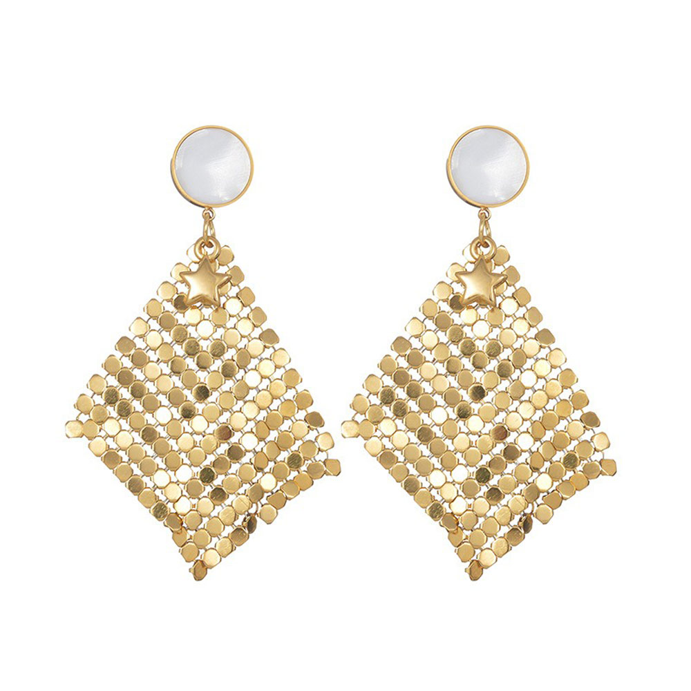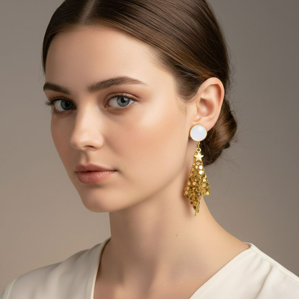 Κομψά κρεμαστά σκουλαρίκια από ανοξείδωτο ατσάλι, με φιλντισένιο στοιχείο στο επάνω μέρος και διακριτικό αστέρι που προσθέτει μια παιχνιδιάρικη αλλά εκλεπτυσμένη πινελιά. Ο ανάλαφρος σχεδιασμός τους χαρίζει κίνηση και λάμψη, καθιστώντας τα ιδανικά για ιδιαίτερες εμφανίσεις από το πρωί έως το βράδυ. Ανθεκτικά στη χρήση και άνετα στην εφαρμογή.