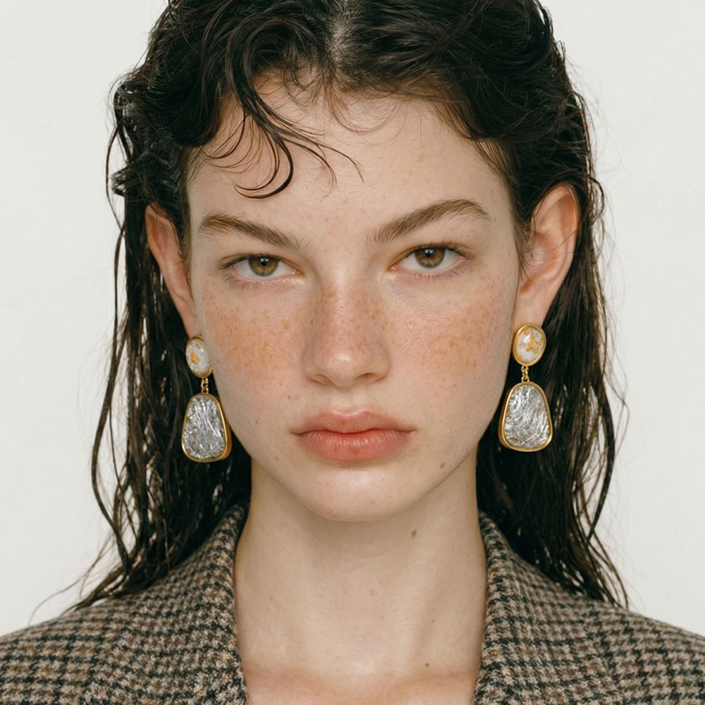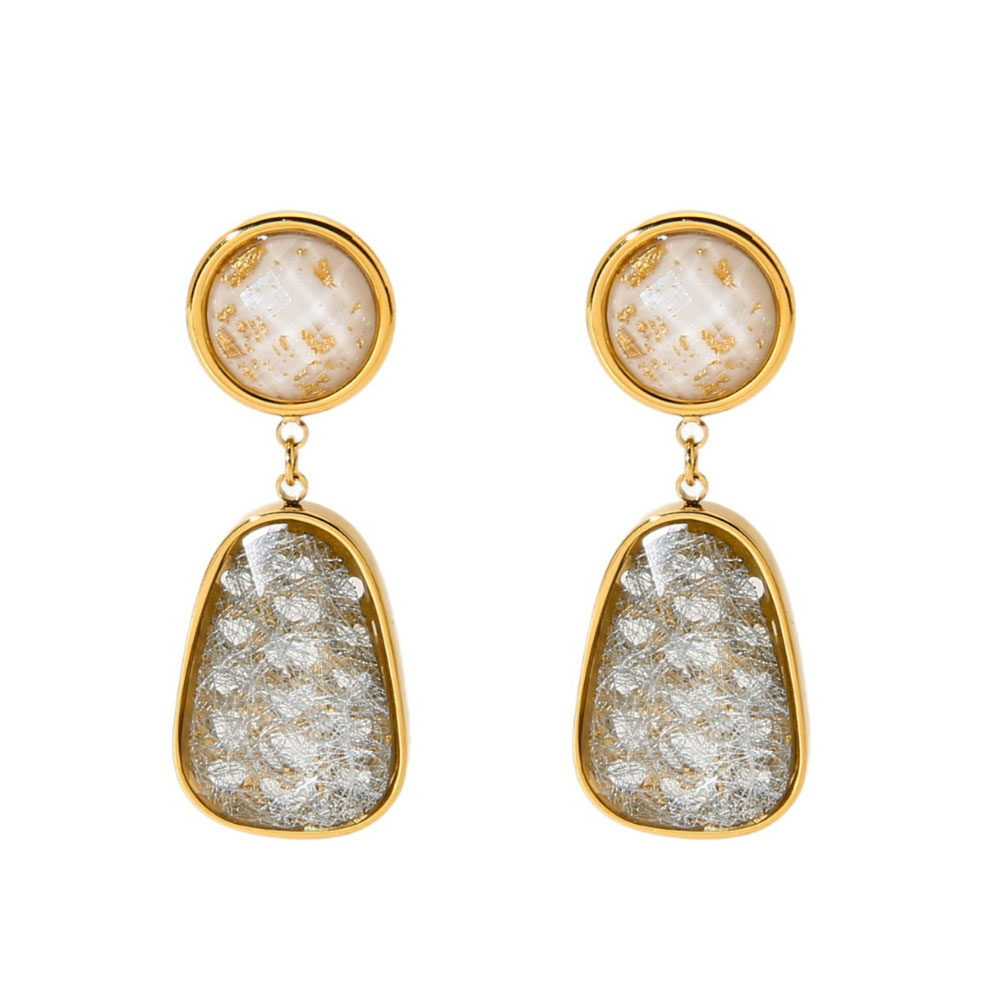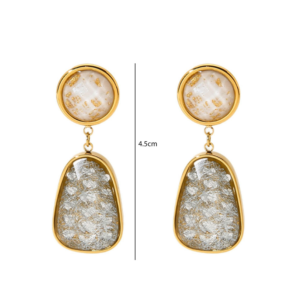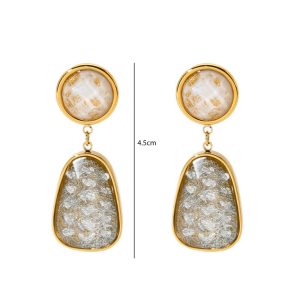 Εντυπωσιακά κρεμαστά σκουλαρίκια από ανοξείδωτο ατσάλι, με κομψό συνδυασμό φυσικής όψης πέτρας και λεπτομερειών φύλλου χρυσού. Ο αρμονικός τους σχεδιασμός δημιουργεί ένα elegant αποτέλεσμα που ξεχωρίζει χωρίς να γίνεται υπερβολικό.