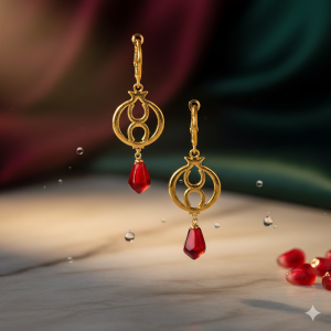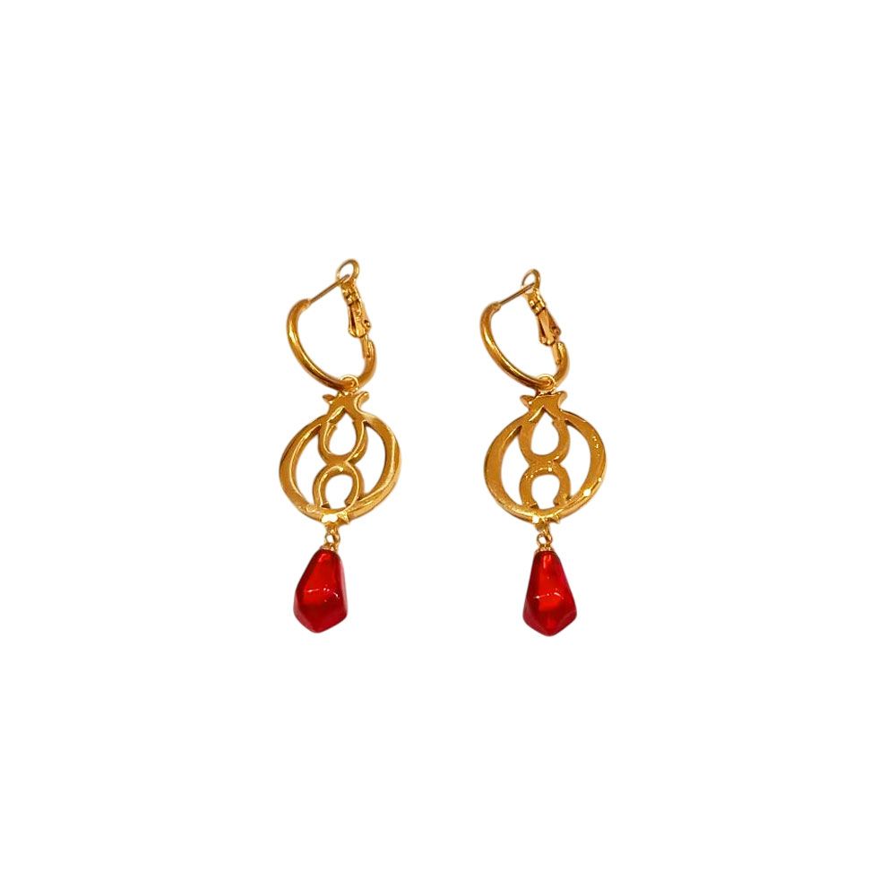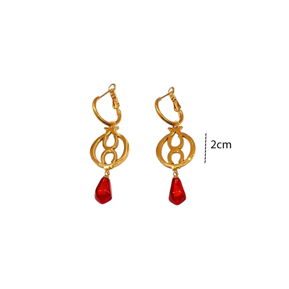 Εντυπωσιακά ατσάλινα σκουλαρίκια με χρυσή απόχρωση και κόκκινες σταγόνες που θυμίζουν ρόδι — σύμβολο τύχης και αφθονίας. Κομψά και λαμπερά, ιδανικά για τις γιορτινές εμφανίσεις ή ως γούρι για τη νέα χρονιά. Ανθεκτικά, υποαλλεργικά και διαχρονικά!