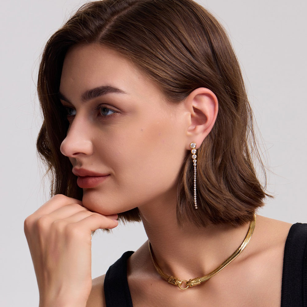 Εντυπωσιακά μακριά σκουλαρίκια από ανοξείδωτο ατσάλι σε χρυσή απόχρωση, διακοσμημένα με λαμπερές λευκές πέτρες σε σταδιακό μέγεθος. Το κομψό, λεπτό τους σχέδιο χαρίζει κίνηση και λάμψη σε κάθε εμφάνιση, ιδανικό για βραδινές εξόδους αλλά και για ιδιαίτερες στιγμές. Ελαφριά, υποαλλεργικά και ανθεκτικά, αποτελούν μια elegant επιλογή που ξεχωρίζει.