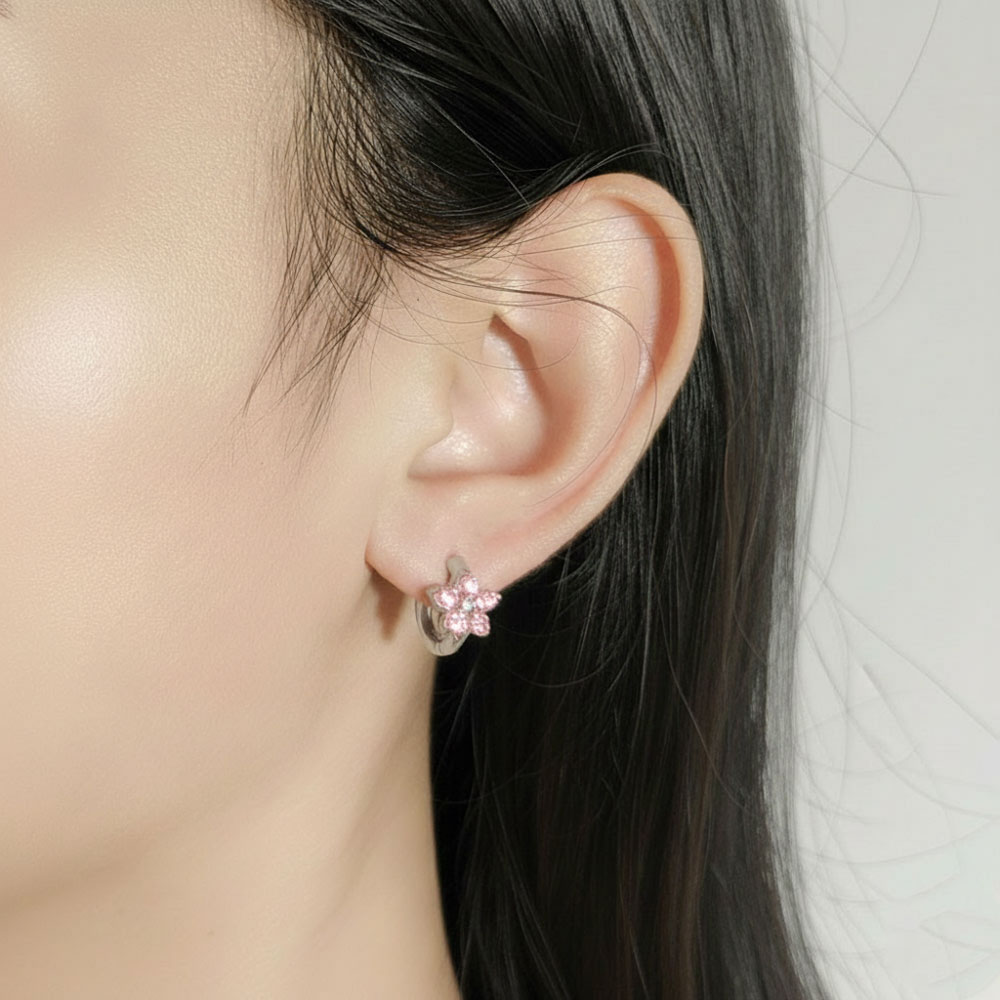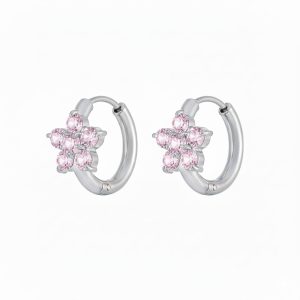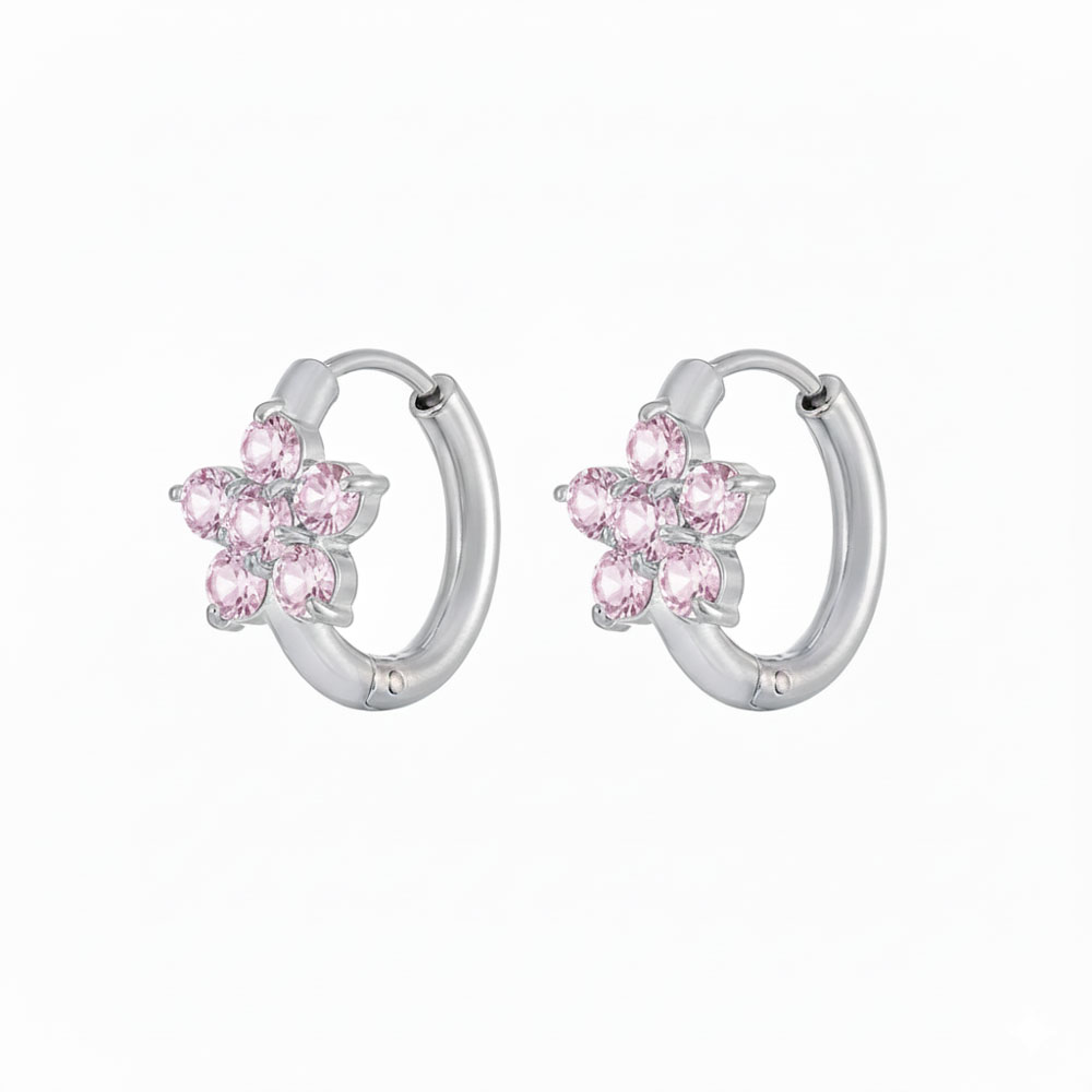 Κομψά σκουλαρίκια κρίκοι από υψηλής ποιότητας ατσάλι σε ασημί απόχρωση, διακοσμημένα με ροζ πέτρες σε σχέδιο λουλουδιού. Λαμπερά, διακριτικά και ιδανικά για καθημερινή χρήση ή πιο ιδιαίτερες εμφανίσεις. Ελαφριά, ανθεκτικά και υποαλλεργικά, αποτελούν τέλεια επιλογή για κάθε στιλ.