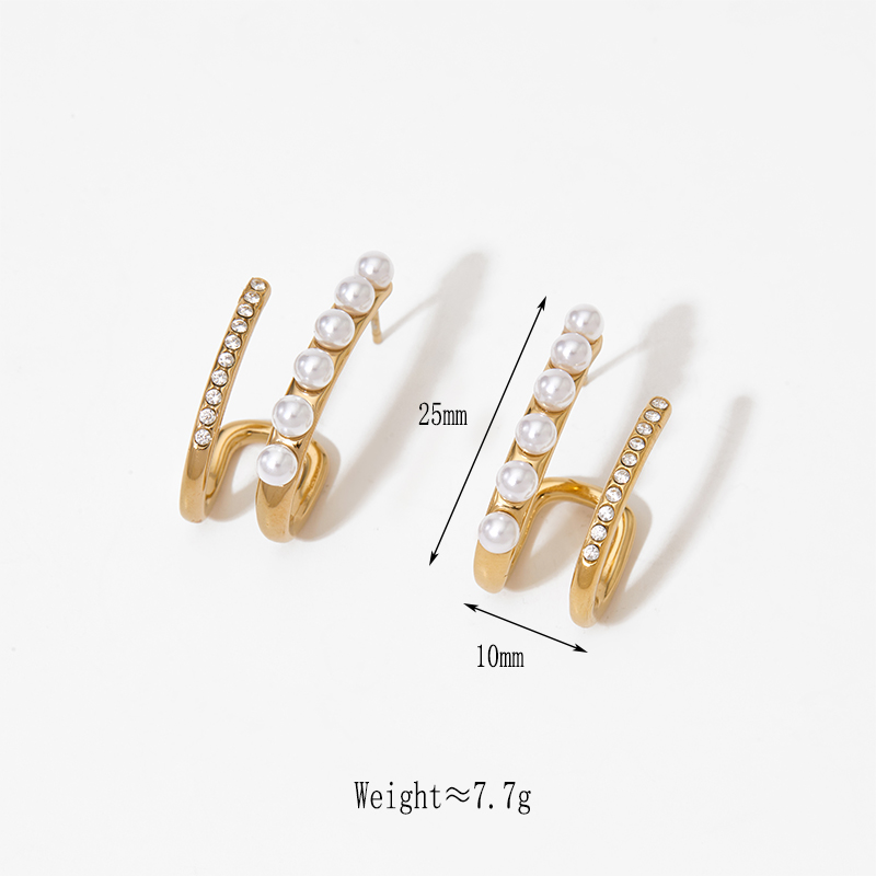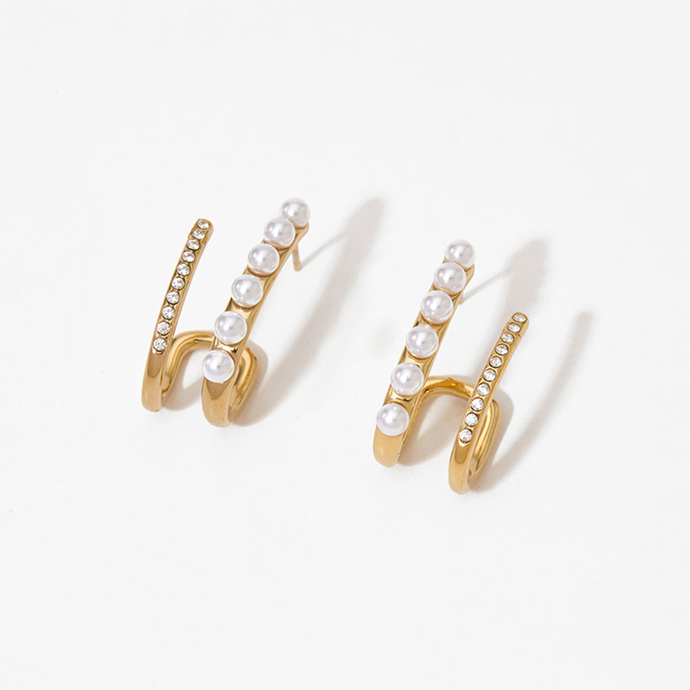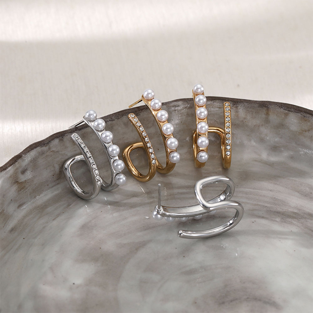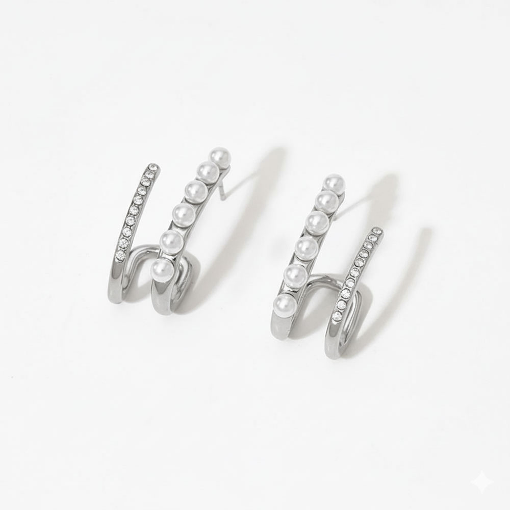 Κομψά σκουλαρίκια από ανοξείδωτο ατσάλι με μοντέρνο, καμπυλωτό σχέδιο που αγκαλιάζει διακριτικά το αυτί. Διακοσμημένα με λευκές πέρλες και λαμπερά κρύσταλλα, προσφέρουν εκλεπτυσμένη λάμψη και θηλυκό χαρακτήρα. Ελαφριά και άνετα στην εφαρμογή, συνδυάζονται ιδανικά με minimal ή πιο εντυπωσιακά σύνολα, προσθέτοντας elegant πινελιά σε καθημερινές και βραδινές εμφανίσεις.