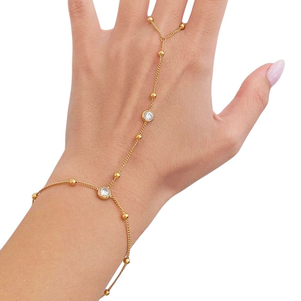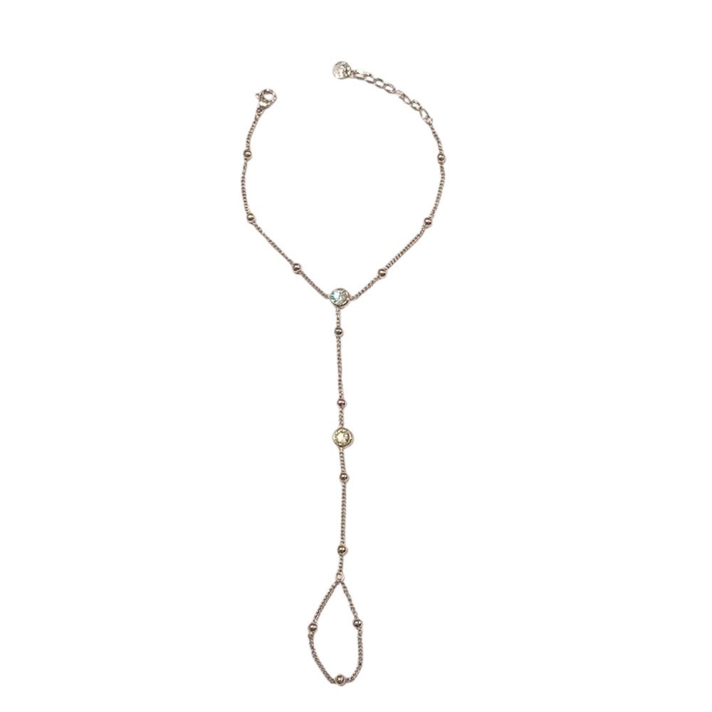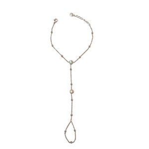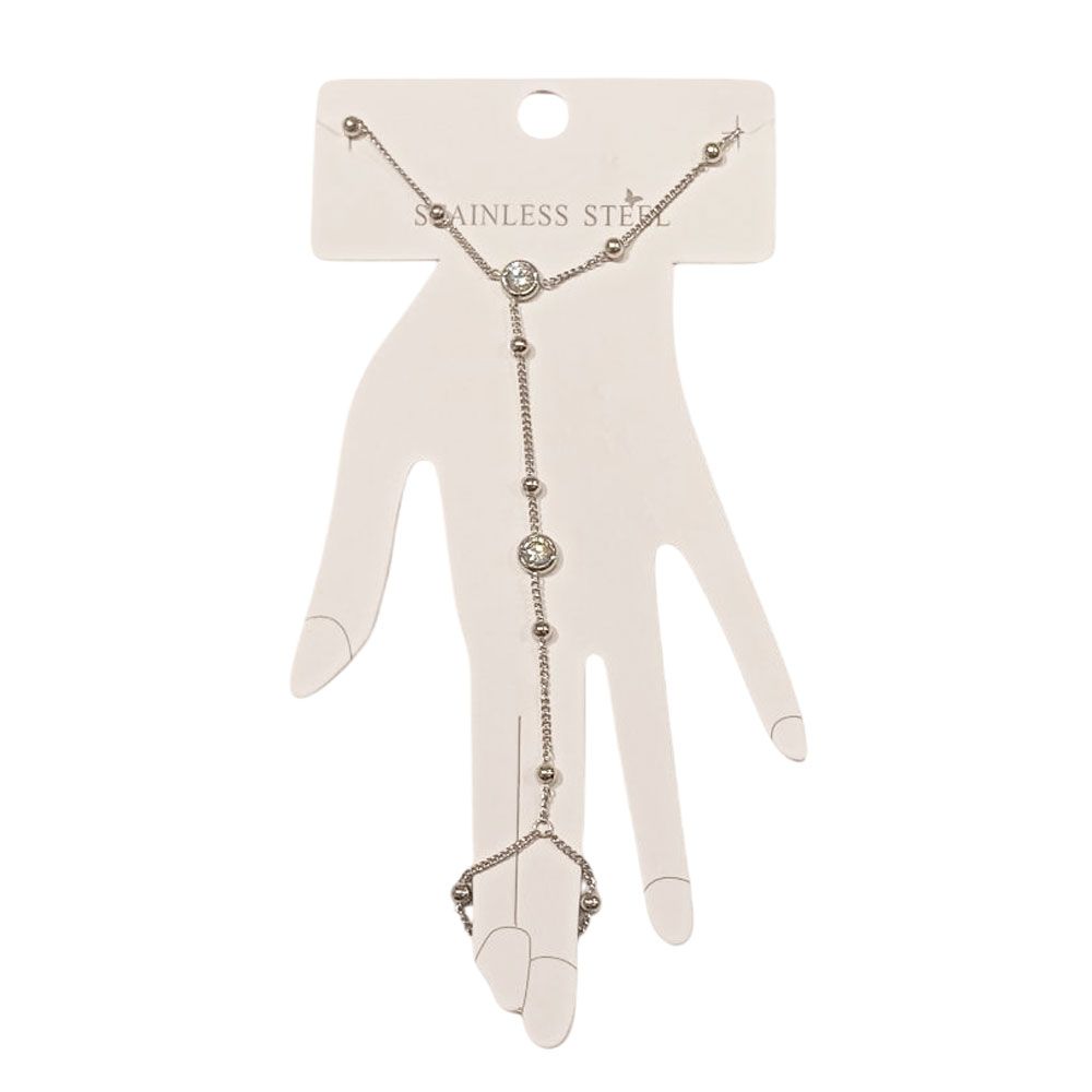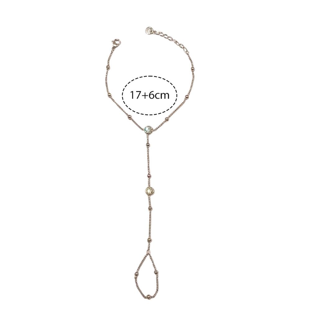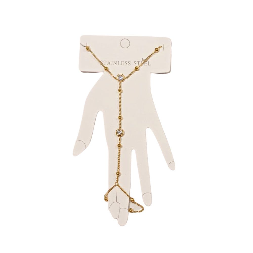 Κομψό βραχιόλι δαχτυλίδι από ανοξείδωτο ατσάλι με διακριτική αλυσίδα και κρυστάλλινες λεπτομέρειες. Συνδυάζει την κομψότητα του βραχιολιού με την ιδιαιτερότητα του δαχτυλιδιού, δημιουργώντας ένα μοναδικό αξεσουάρ που αγκαλιάζει το χέρι. Ιδανικό για βραδινές εμφανίσεις αλλά και για καθημερινό στιλ με ιδιαίτερο χαρακτήρα. Διατίθεται σε χρυσό και ασημί.