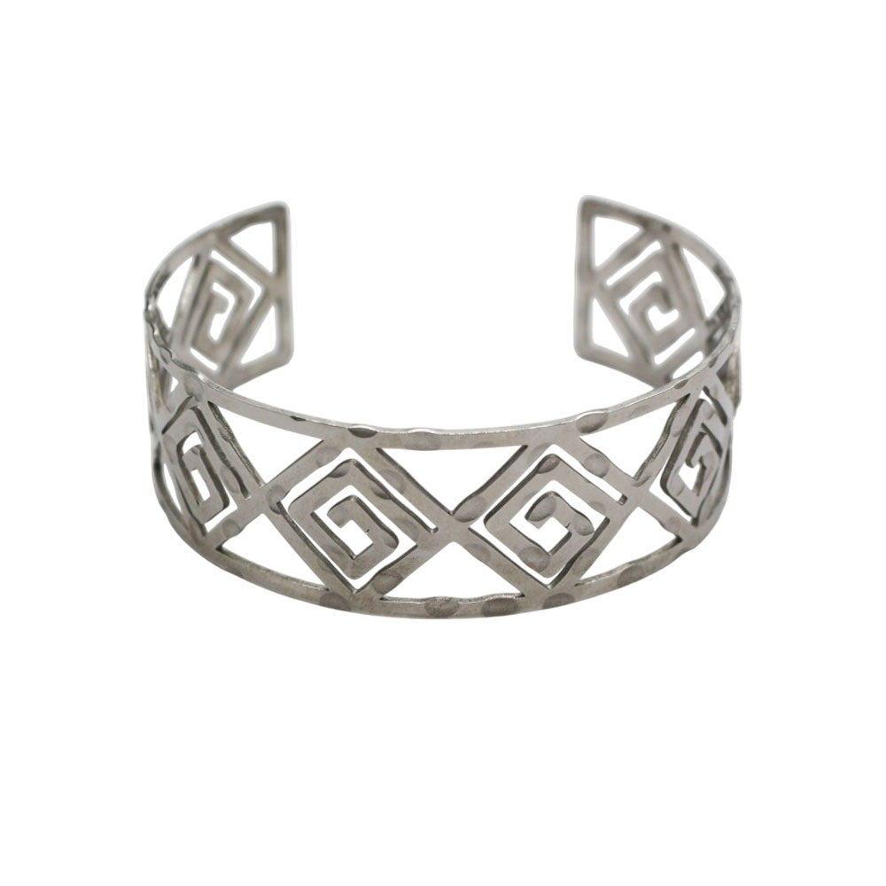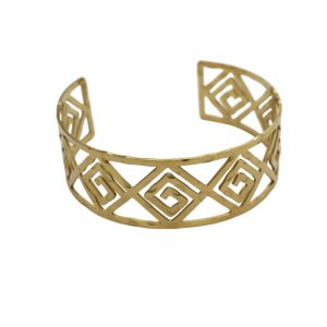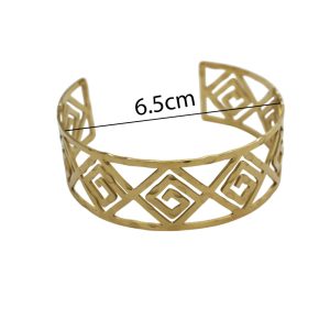 Κομψό βραχιόλι από ανοξείδωτο ατσάλι, διακοσμημένο με περίτεχνα γεωμετρικά μοτίβα που χαρίζουν μοντέρνα αλλά και διαχρονική αισθητική.Η ανοιχτή του μορφή προσφέρει άνετη και ευέλικτη εφαρμογή, ενώ το ιδιαίτερο ανάγλυφο σχέδιο το κάνει ιδανικό για καθημερινές αλλά και πιο κομψές εμφανίσεις.
