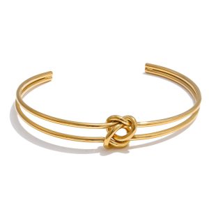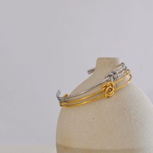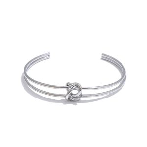 Κομψό και μινιμαλιστικό βραχιόλι από ανοξείδωτο ατσάλι, διακοσμημένο με μοντέρνο κόμπο στο κέντρο — σύμβολο ενότητας και διαχρονικής κομψότητας.Ο διπλός μεταλλικός σχεδιασμός χαρίζει ιδιαίτερο χαρακτήρα, ενώ το ανοιχτό του σχήμα επιτρέπει άνετη εφαρμογή στον καρπό.