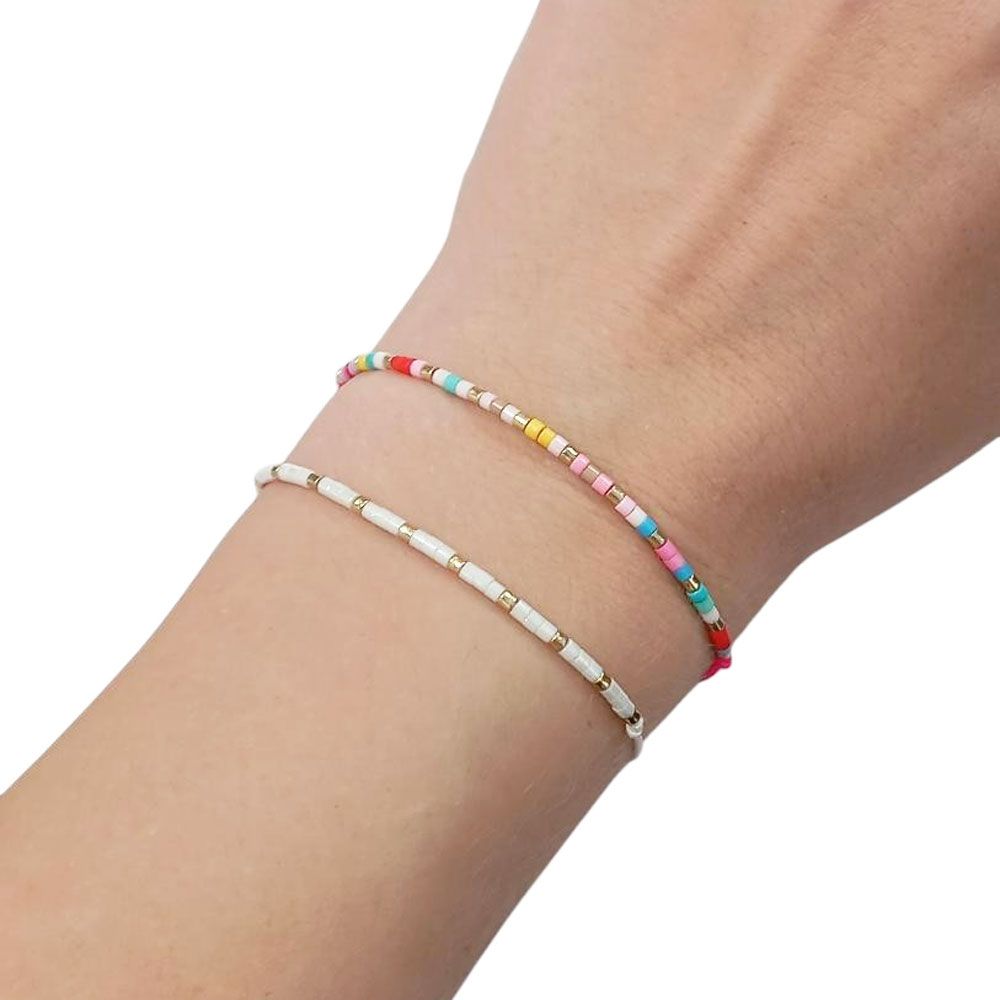Στυλάτα minimal βραχιόλια με λεπτές γυάλινες χάντρες σε διάφορους χρωματικούς συνδυασμούς. Το λεπτό αυξομειούμενο κορδόνι τα καθιστά ιδανικά για κάθε καρπό και κάθε ηλικία. Φοριούνται άνετα μόνα τους ή σε συνδυασμό για ένα μοντέρνο layered look. Ιδανικά για καλοκαιρινά outfit, τουριστικά είδη ή δώρα. Σετ 12 τεμαχίων με καρτελάκι.